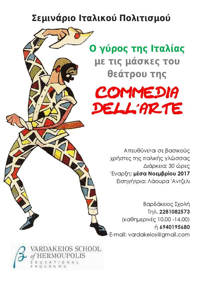 Σεμινάριο Ιταλικού Πολιτισμού με θέμα "Ο γύρος της Ιταλίας με τις μάσκες του θεάτρου της COMMEDIA DELL' ARTE" προγραμματίζεται στη Βαρδάκειο Σχολή Ερμούπολης.