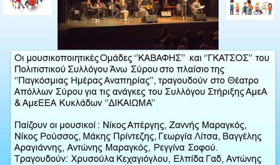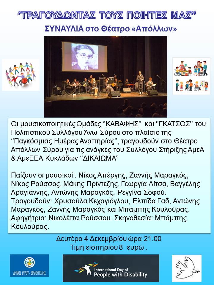 Β. Την Δευτέρα 4 Δεκεμβρίου θα διεξαχθεί συναυλία με τίτλο: ‘’ΤΡΑΓΟΥΔΩΝΤΑΣ ΤΟΥΣ ΠΟΙΗΤΕΣ ΜΑΣ’’ που είναι προσφορά, για ενίσχυση του Συλλόγου “ΔΙΚΑΙΩΜΑ” , από τις μουσικές ομάδες Γκάτσος και Καβάφης του πολιτιστικού Συλλόγου άνω Σύρου.