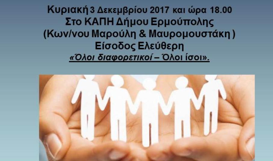 Α. Την Κυριακή 3 Δεκεμβρίου θα γίνει ημερίδα με τίτλο “ΟΛΟΙ ΔΙΑΦΟΡΕΤΙΚΟΙ ΟΛΟΙ ΙΣΟΙ” με τοποθετήσεις ειδικών πάνω σε ζητήματα που αφορούν τα άτομα με αναπηρία και τα άτομα με Εκπαιδευτικές Ανάγκες. Η εκδήλωση θα γίνει στο χώρο του ΚΑΠΗ Ερμούπολης στις 6 μμ Η είσοδος είναι ελεύθερη.