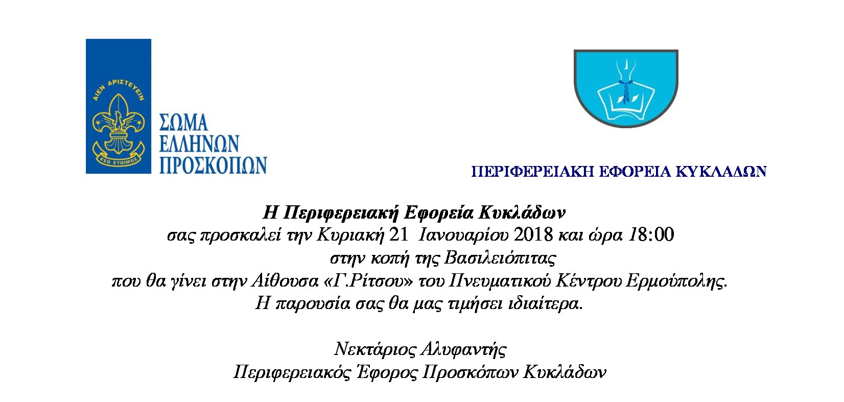 Στις 21 Ιανουαρίου έχει προγραμματισθεί η επίσημη εκδήλωση κοπής της πρωτοχρονιάτικης πίτας για την Περιφερειακή Εφορεία Κυκλάδων, που θα λάβει χώρα στην αιθ. του Πνευματικού Κέντρου Γ. Ρίτσος (18.00).