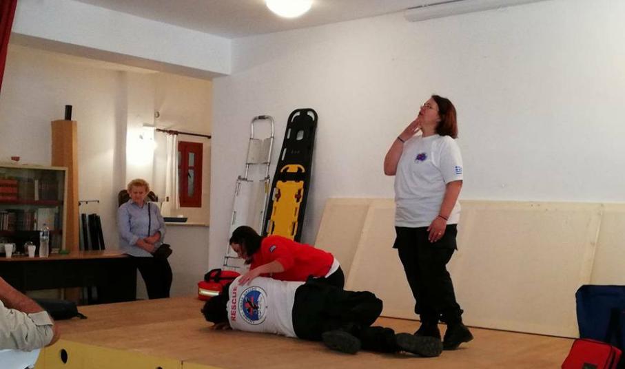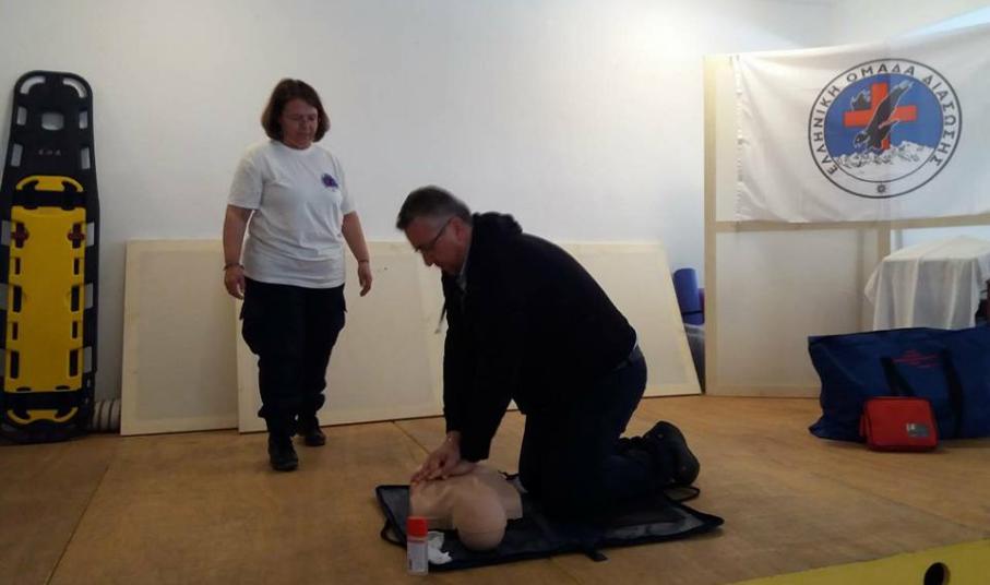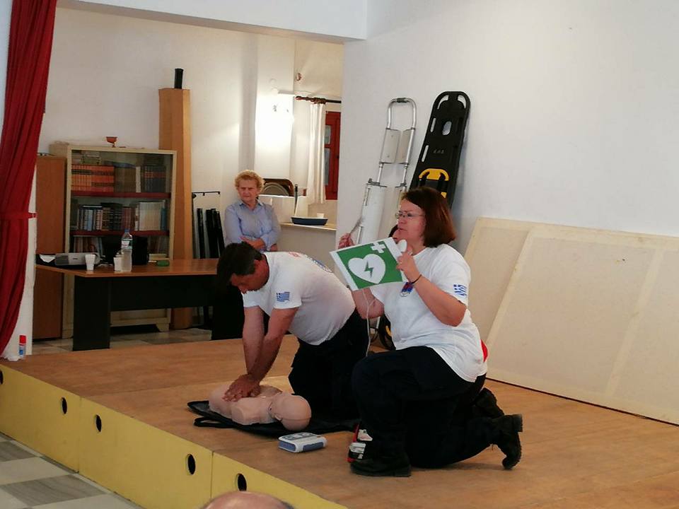 Στη συνέχεια τα Πιστοποιημένα μέλη της ΕΟΔ παρουσίασαν την τεχνική Καρδιοαναπνευστικής Αναζωογόνησης (ΚΑΡΠΑ) με χρήση Αυτόματου Εξωτερικού Απινιδωτή, τη Θέση Ασφαλείας (Ανάνηψης) και τρόπους αντιμετώπισης Πνιγμονής.