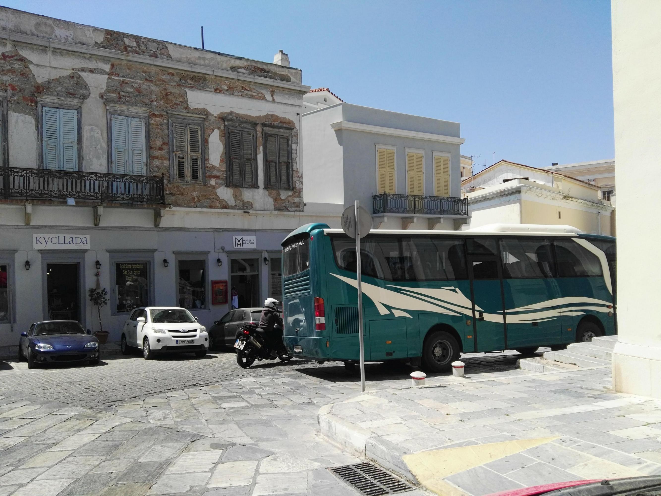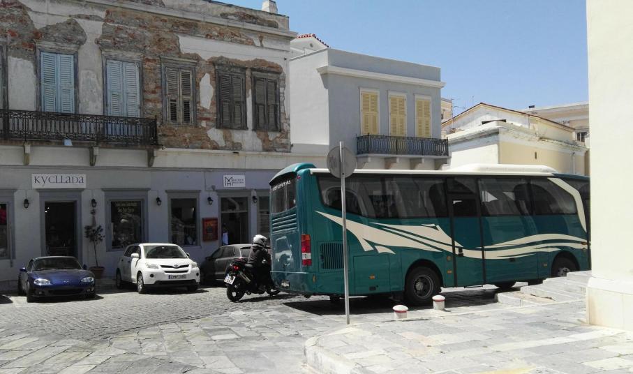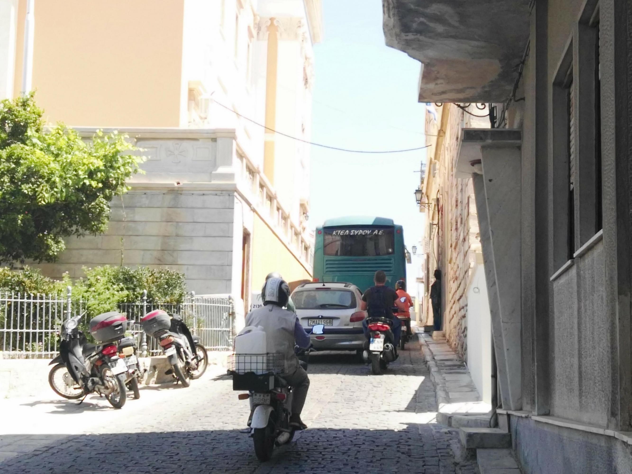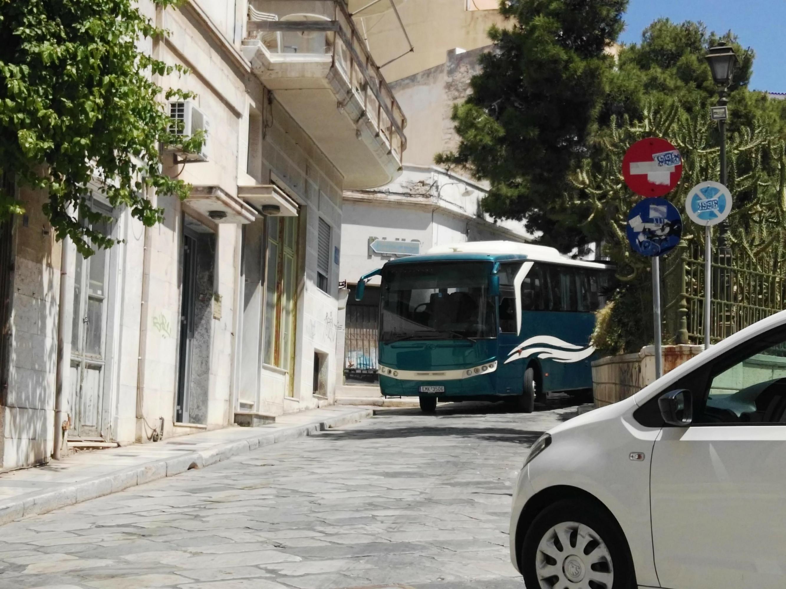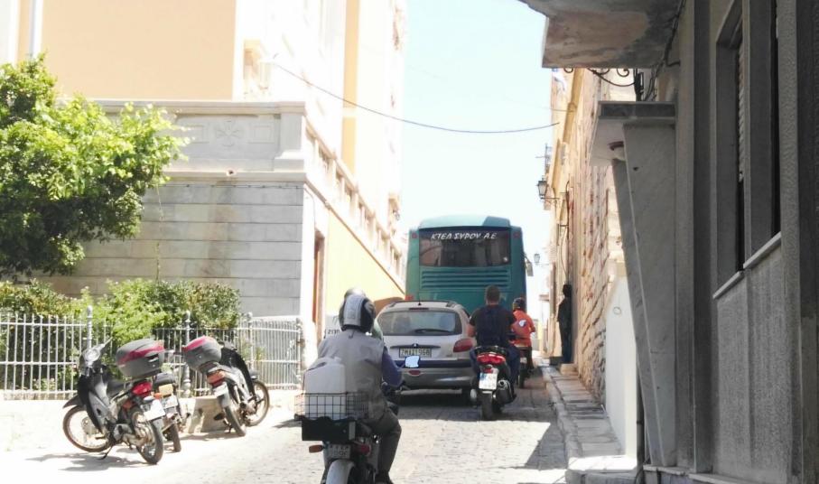 Κυκλοφοριακά θέματα ανακύπτουν από τη διέλευση μεγάλων λεωφορείων της ΚΤΕΛ Σύρου ΑΕ από μικρές οδούς στο κέντρο της Ερμούπολης, όπως συγκεκριμένα διαπιστώθηκε χθες το μεσημέρι (12.00), οπότε κι ένα από το “στόλο” της εταιρείας παρέμεινε για μικρό χρονικό διάστημα όπισθεν του Ι.Ν. Αγίου Νικολάου, αλλά και μπροστά από το θέατρο “Απόλλων”.