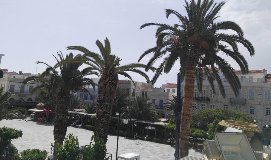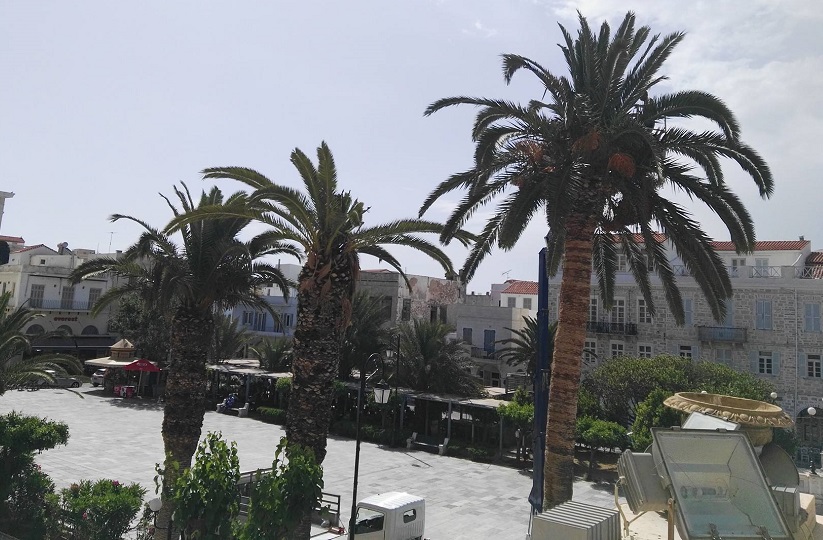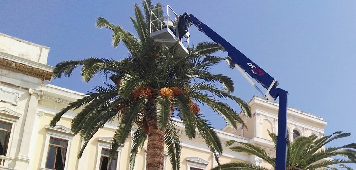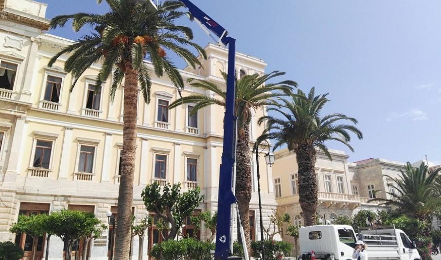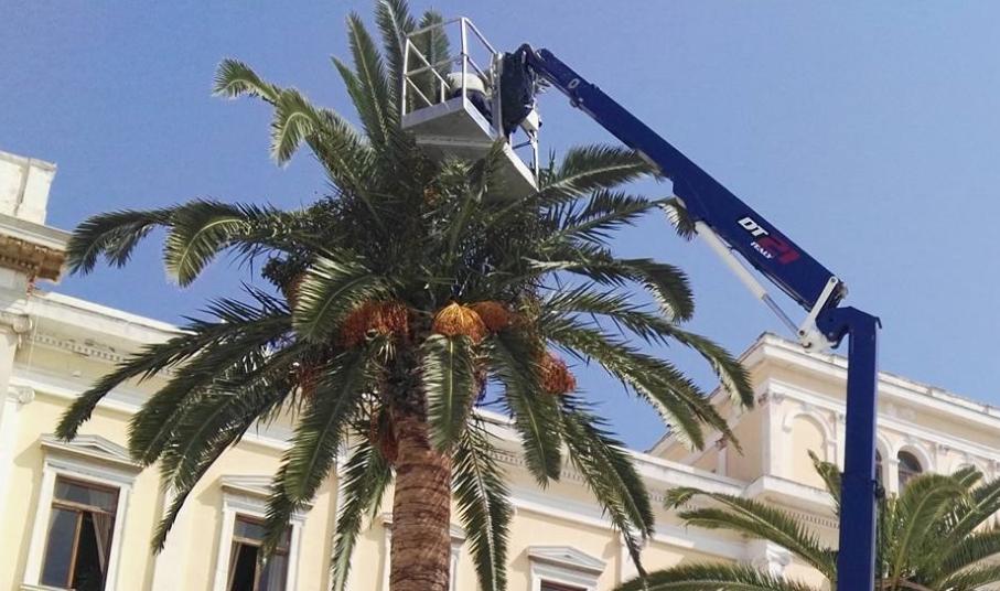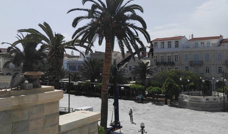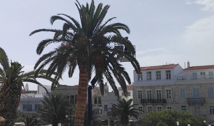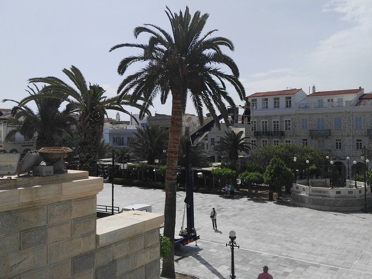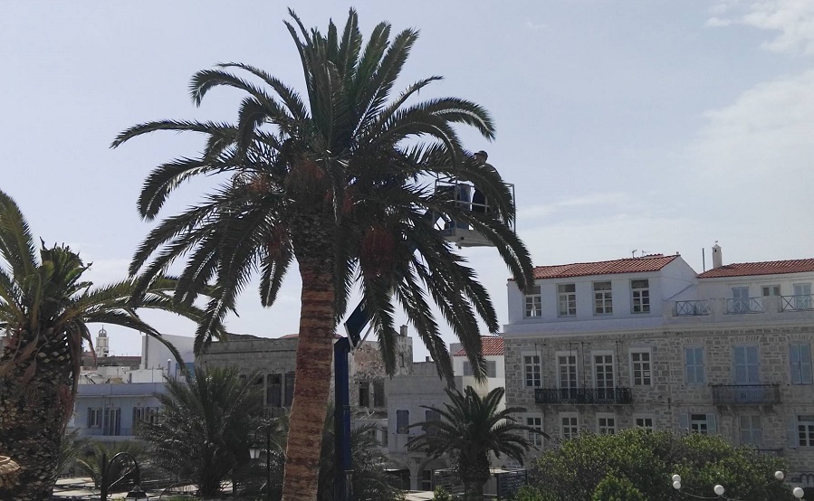 Προγραμματισμένες εργασίες ψεκασμών στους φοίνικες της πλατείας Μιαούλη, από τους αρμόδιους εργάτες του Δήμου Σύρου – Ερμούπολης
