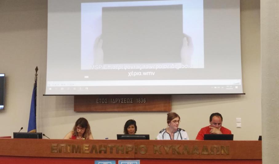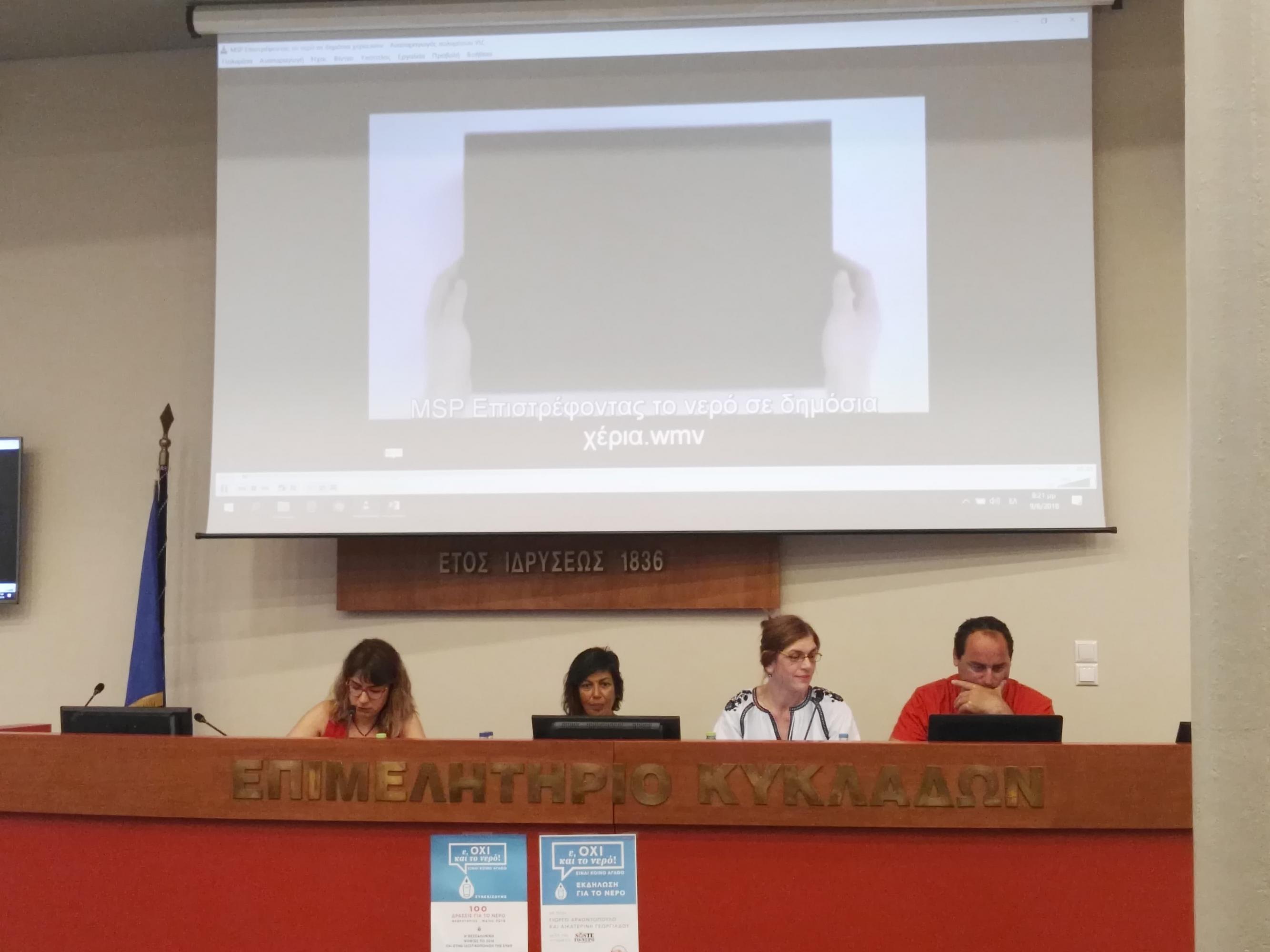 Το βράδυ του Σαββάτου, με προσκεκλημένα μέλη του κινήματος “SOSτε το νερό”, τον πρόεδρο του Σωματείου Εργαζομένων της ΕΥΑΘ, Γιώργο Αρχοντόπουλο και τη νομικό, Κατερίνα Γεωργιάδου, η δημοτική παράταξη προχώρησε σε μία άκρως ενημερωτική εκδήλωση σχετικά με το τί θα σημάνει η ιδιωτικοποίηση του νερού για τους πολίτες, κατά τη διάρκεια της οποίας, όσοι παρευρέθηκαν στην αίθουσα εκδηλώσεων του Επιμελητηρίου Κυκλάδων, είχαν την ευκαιρία να πληροφορηθούν επισταμένα τόσο για τους σχεδιασμούς της κυβέρνησης, όσο και για άλλες περιπτώσεις χωρών σε ευρωπαϊκό και διεθνές επίπεδο.