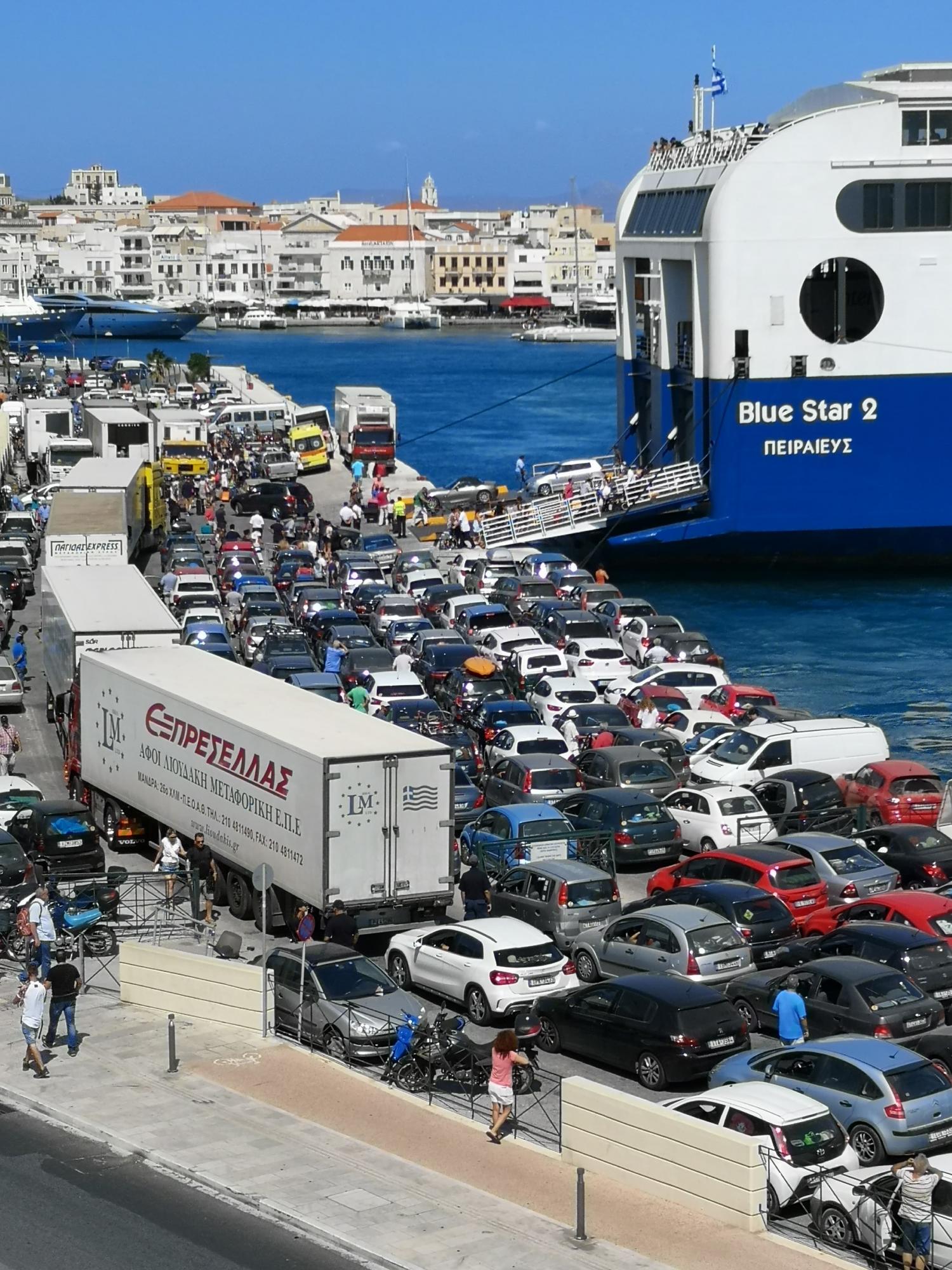 Οι εικόνες αφορούν στο μεσημεριανό δρομολόγιο του Blue Star 2 με προορισμό το λιμάνι του Πειραιά και όπως διαπιστώνεται τα οχήματα και τα δίκυκλα έχουν κατακλύσει τον εσωτερικό χώρο του λιμανιού.