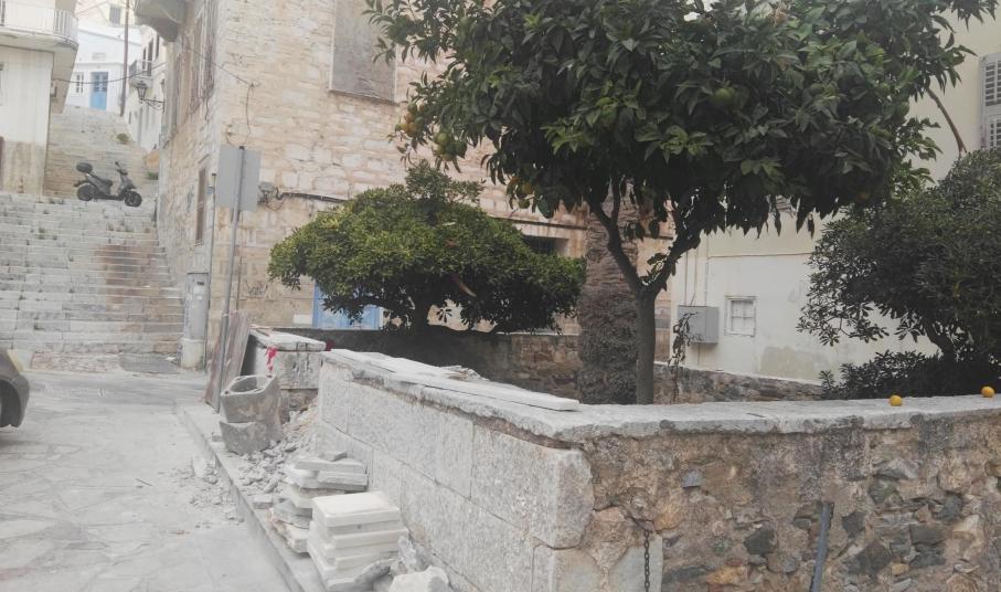 Σε εξέλιξη είναι οι σωτήριες παρεμβάσεις στα πλακόστρωτα της Ερμούπολης, με τη σχετική εργολαβία να “τρέχει” την παρούσα περίοδο στην πλατεία Στ. Βαφία καθώς και σε τμήματα πλησίον του Ι.Ν. Μεταμορφώσεως του Σωτήρος.