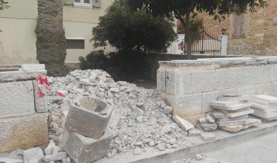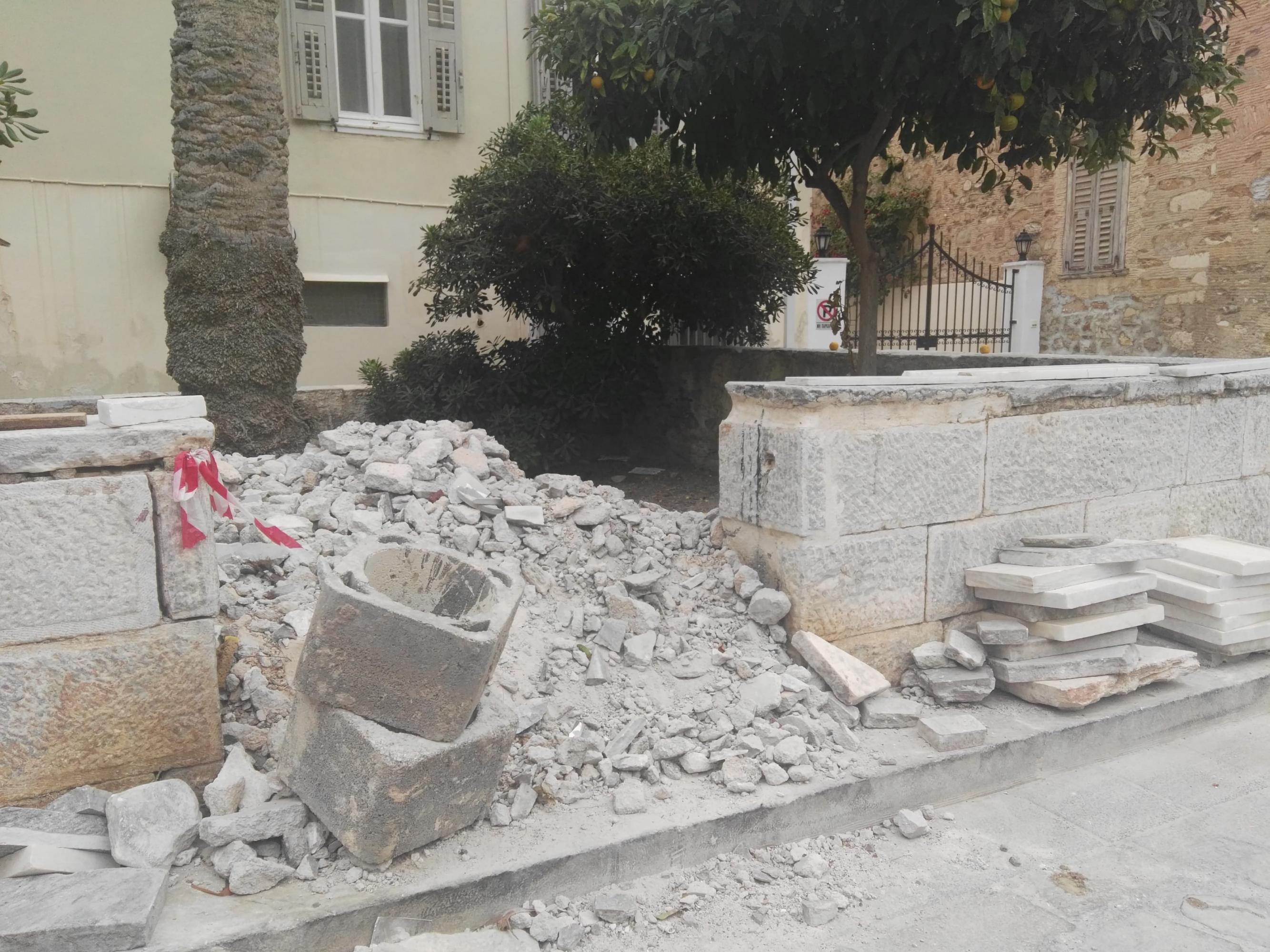 Ο πρόσφατες εργασίες όμως, δεν συνοδεύτηκαν από την άμεση απομάκρυνση των επιπλέον μαρμάρων, οι οποίες κι έχουν τοποθετηθεί στο μικρό κηπάριο στης εισόδου της πλατείας Στ. Βαφία.
