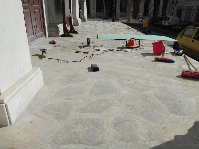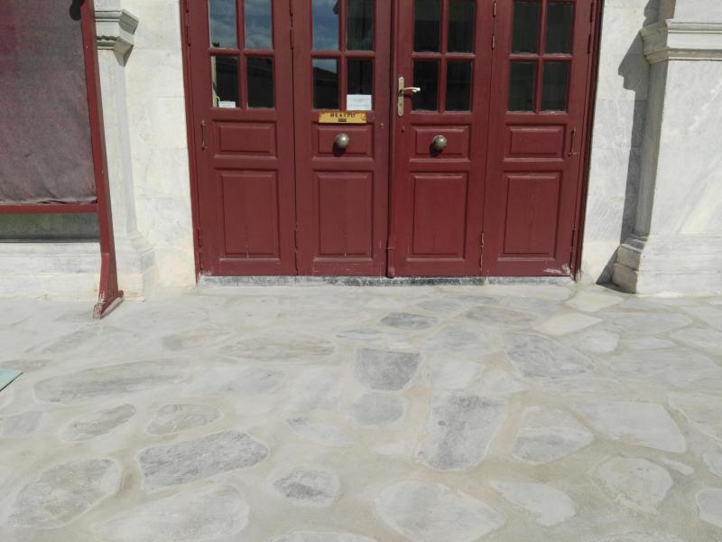 Σε συνέχεια της μεγάλης αισθητικής αναβάθμισης που υλοποιήθηκε με το φρεσκάρισμα και το βάψιμο των εξωτερικών επιφανειών του θεάτρου της Ερμούπολης, έρχονται οι σχετικές εργασίες στα σκαλοπάτια της εισόδου, τα οποία επιχειρείται να διατηρήσουν τον ιδιαίτερο χαρακτήρα τους καθώς τμήματα αυτών συνδέονται με τα παραδοσιακά πλακόστρωτα που γειτνιάζουν.