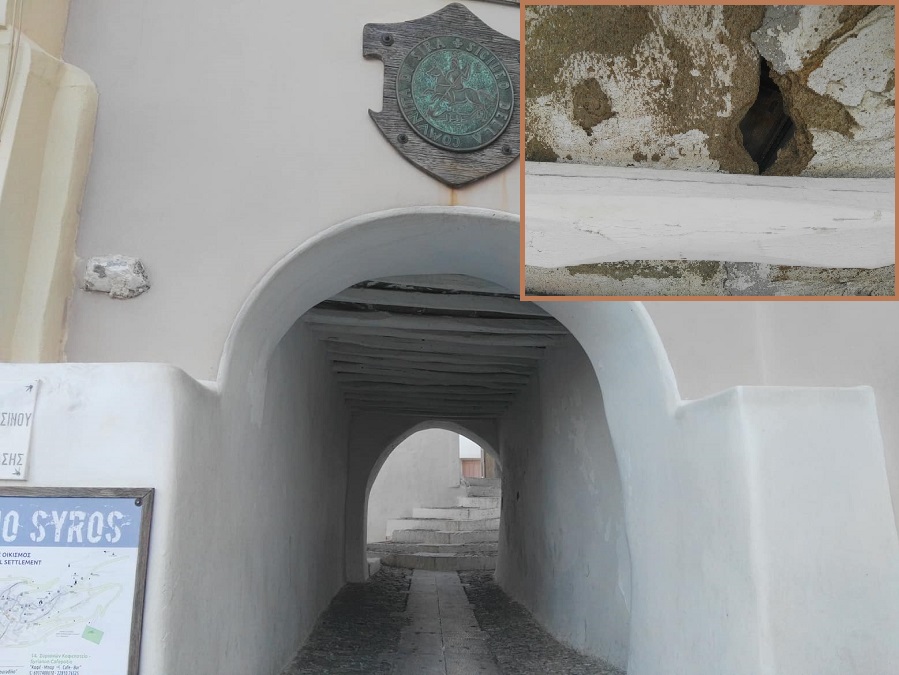 Συστηματικά αποκολλώνται “φλούδες” σοβάδων από την οροφή της εισόδου του μεσαιωνικού οικισμού της Άνω Σύρου, καθώς ως φαίνεται ο χρόνος έχει προκαλέσει αρκετές φθορές, με την ανάγκη μέριμνας εκ μέρους της αρμόδιας Υπηρεσίας του Δήμου Σύρου – Ερμούπολης να κρίνεται απαραίτητη.