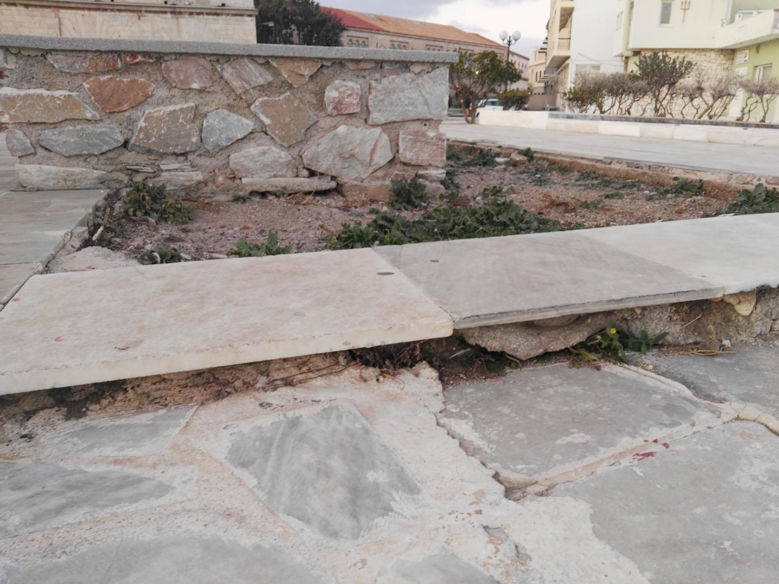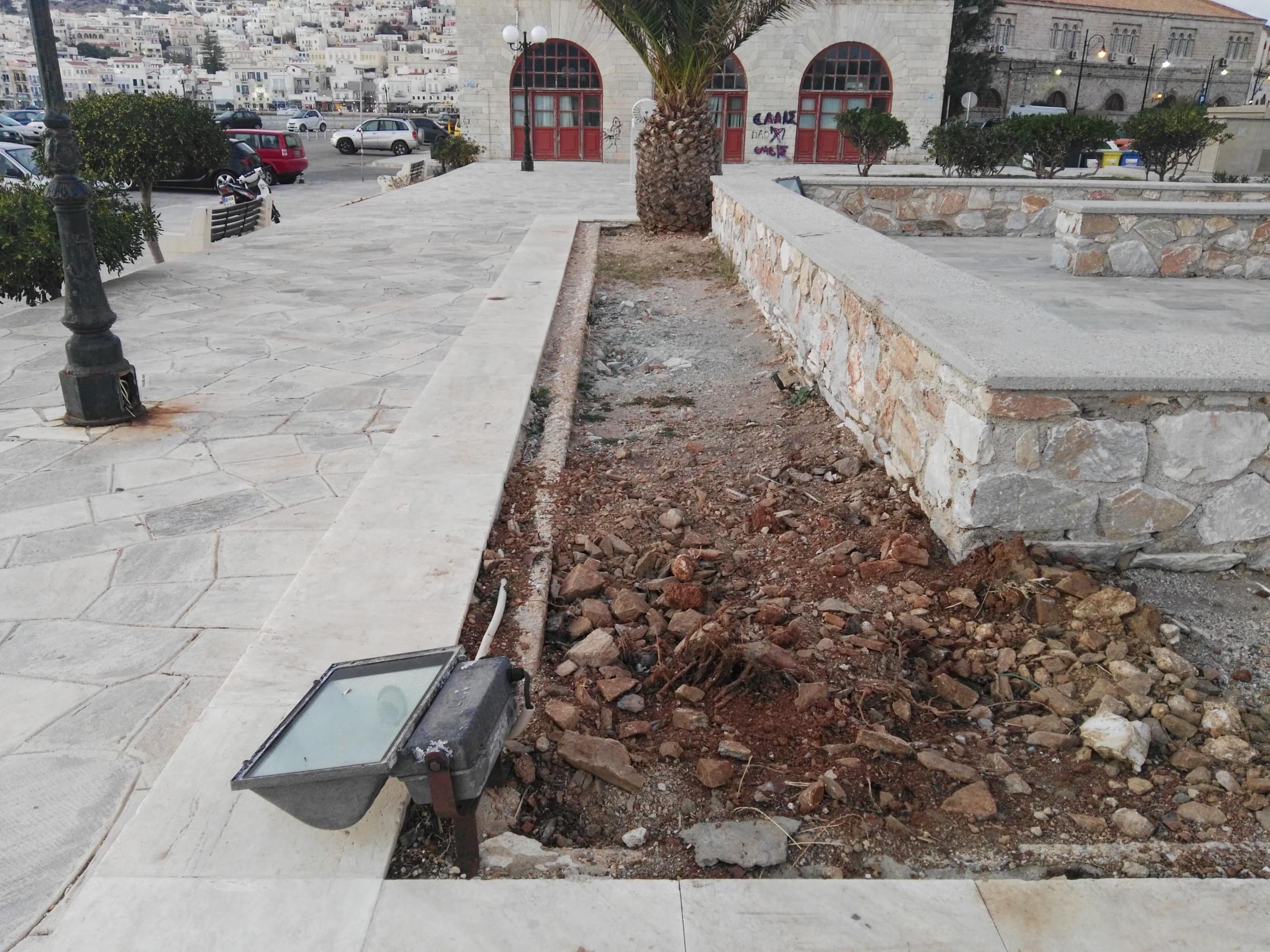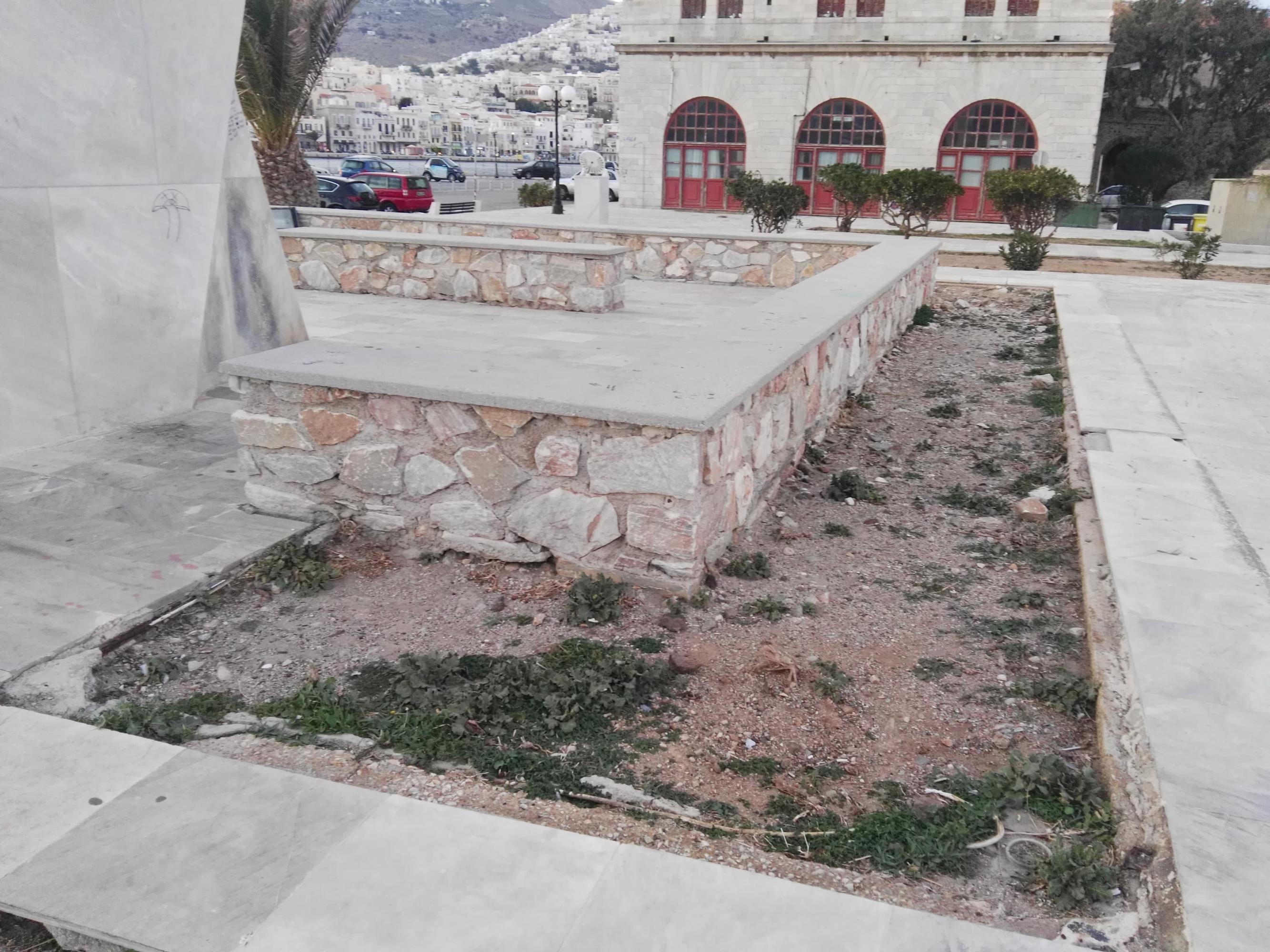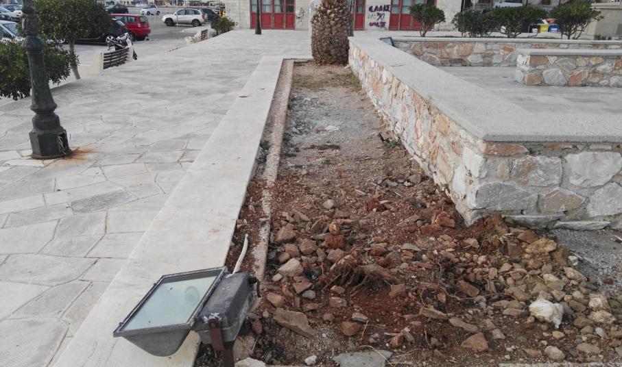 Ενδεικτικά αξίζει να αναφερθεί η αποκόλληση μαρμάρων, όπως ακόμη και το βάψιμο μερικών τμημάτων τους με ανεξίτηλα σπρέι, ενώ τέλος, η δημοτική πλευρά οφείλει να φροντίσει και για την αναζωογόνηση του πρασίνου της πλατείας.