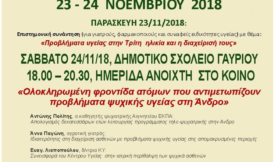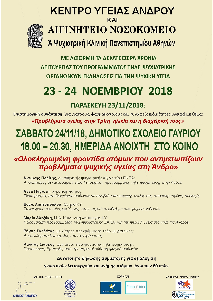 Το Κέντρο Υγείας Άνδρου και η Α΄ψυχιατρική κλινική Αιγινητείου του Ε.Κ.Π.Α, με αφορμή τα δεκατέσσερα χρόνια λειτουργίας του προγράμματος Τηλε-ψυχιαρικής οργανώνουν τριήμερο για την ψυχική υγεία στις 22-24 Νοεμβρίου 2018.