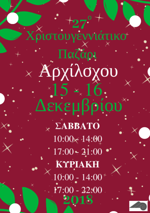 Ο Πολιτιστικός σύλλογος «Αρχίλοχος» θα διοργανώσει το καθιερωμένο 27Ο Χριστουγεννιάτικο παζάρι στις 15 και 16 Δεκεμβρίου 2018. Το Χριστουγεννιάτικο Παζάρι θα είναι ανοικτό το Σάββατο από τις 10 π.μ μέχρι τις 14:00 μ.μ και από τις 17.00 μ.μ μέχρι τις 21.00 και την Κυριακη από τις 10.00 μ.μ μέχρι τις 14.00 και από τις 17.00 π.μ μέχρι τις 22.00 π.μ. Σας προσκαλούμε να πάρετε μέρος στην Χριστουγεννιάτικη γιορτή μας.