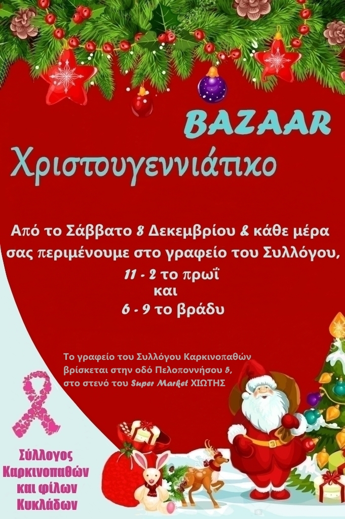 Χριστουγεννιάτικο bazaar από τον Σύλλογο Καρκινοπαθών Σύρου Τετάρτη 5 Δεκεμβρίου 2018 - 14:49 Διαφήμιση Χριστουγεννιάτικο bazaar από τον Σύλλογο Καρκινοπαθών Σύρου. Διαφήμιση Δείτε τη φωτογραφία. #Κοινωνία #Κοινωνικά #bazaar