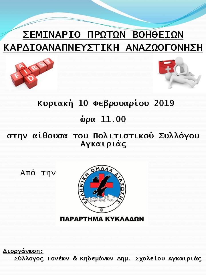 Σεμινάριο πρώτων βοηθειών διοργανώνει η ΕΟΔ Κυκλάδων την Κυριακή 10 Φεβρουαρίου στις 11 το πρωί στην Αίθουσα Πολιτιστικού Συλλόγου Αγκαιριάς.