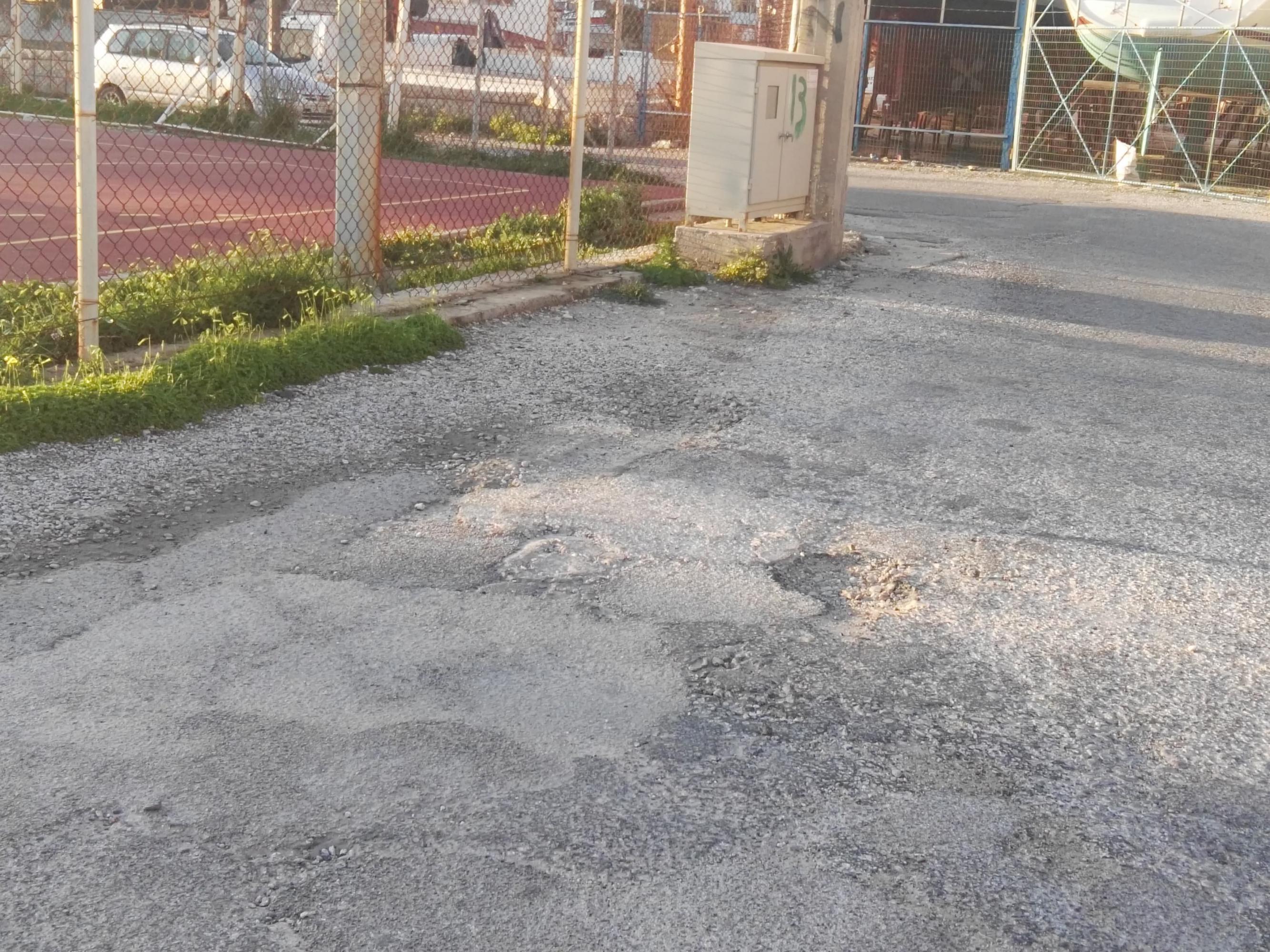 Μικρές λακκούβες και αποκολλήσεις χαλικιών διαμορφώνουν επικίνδυνο το οδόστρωμα κυρίως για τους οδηγούς μηχανών που μετακινούνται από και προς τα δημοτικά γήπεδα, γεγονός που πρέπει να λάβει σοβαρά υπόψιν η Δημοτική πλευρά, ώστε να δρομολογήσει ανάλογη εργασία.