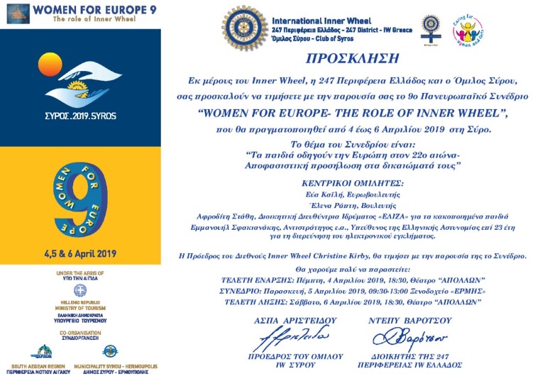 Πρόσκληση για το Ευρωπαϊκό Συνέδριου του Inner Wheel “WOMEN FOR EUROPE 9”, που διοργανώνει η 247 Περιφέρεια Inner Wheel Ελλάδος και ο Όμιλος Inner Wheel Σύρου, στην Ερμούπολη από 4-6/4/2019.