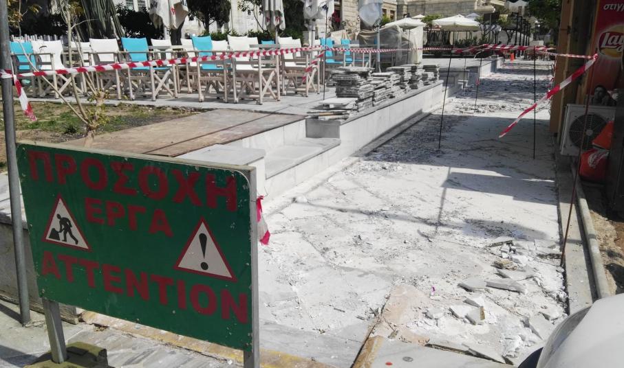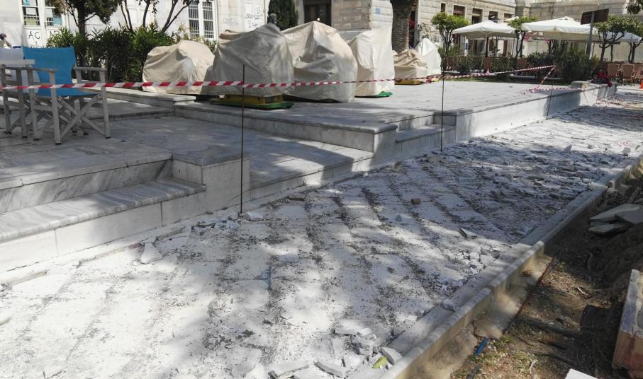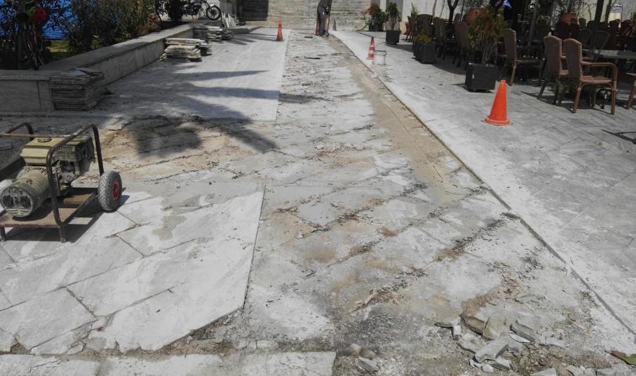 Ήδη από προχθές με μηχανήματα έργου έχει ξεκινήσει η διαδικασία της προσεκτικής αποκόλλησης των μαρμάρων ώστε να ακολουθήσουν οι προγραμματισμένες επεμβάσεις και η τοποθέτηση του νέου αγωγού.