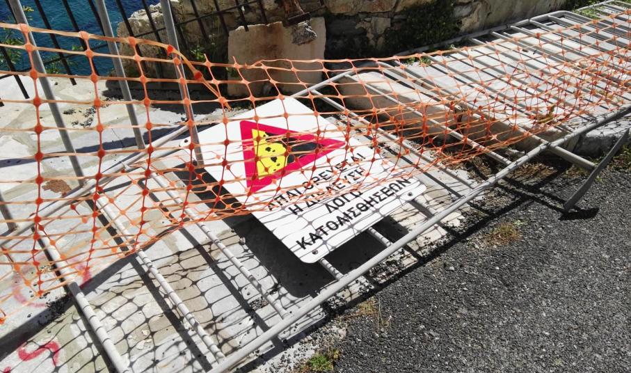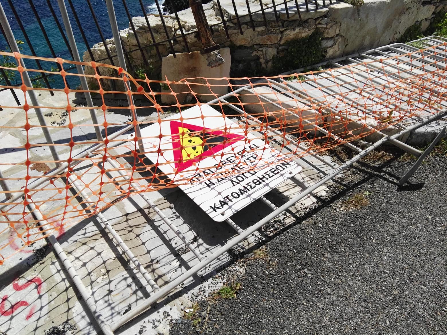 Συγκεκριμένα, η πτώση του απαγορευτικού σήματος καθώς και η μετατόπιση του πορτοκαλί πλέγματος αλλά και η αποκόλληση των κάθετων μεταλλικών βάσεων επί των οποίων αυτό στηρίζεται, “γεννούν” ανησυχία, αφού μικρά παιδιά ή πολίτες κι επισκέπτες που δεν έχουν ενημερωθεί για τις σχετικές απαγορεύσεις, δεν αποκλείεται να κινδυνεύσουν, αν διέλθουν από το πεζοδρόμιο.