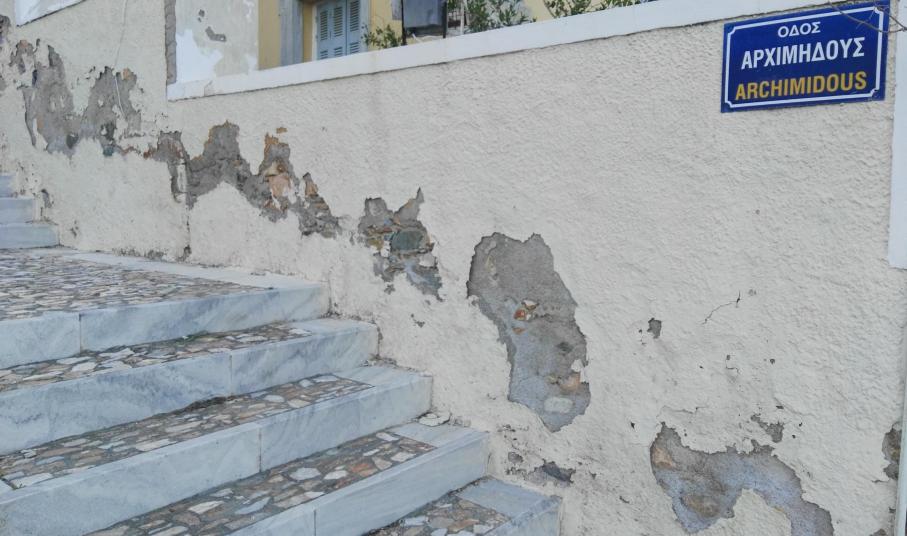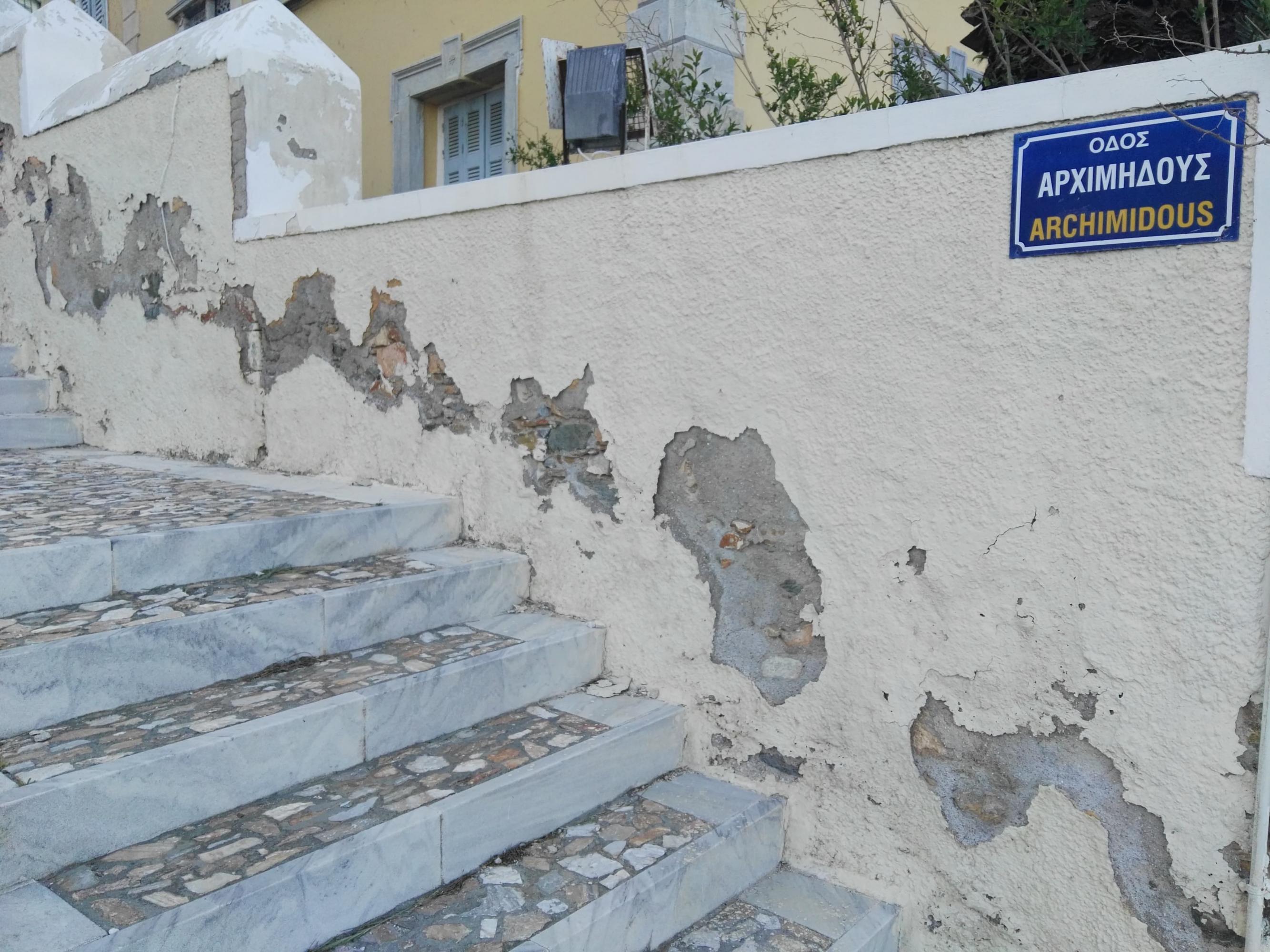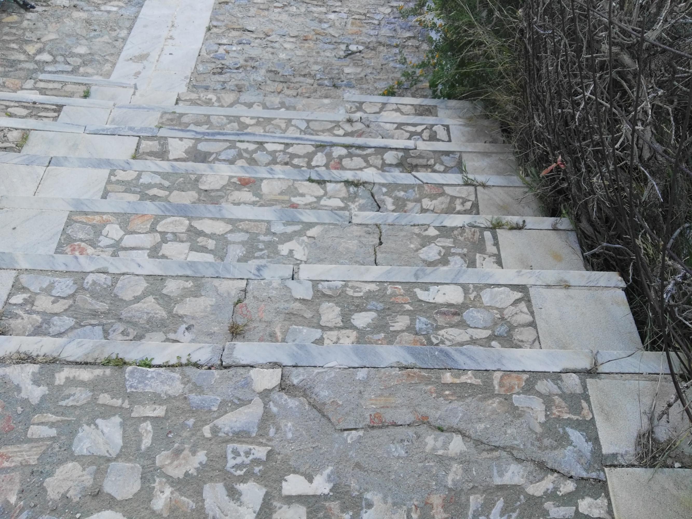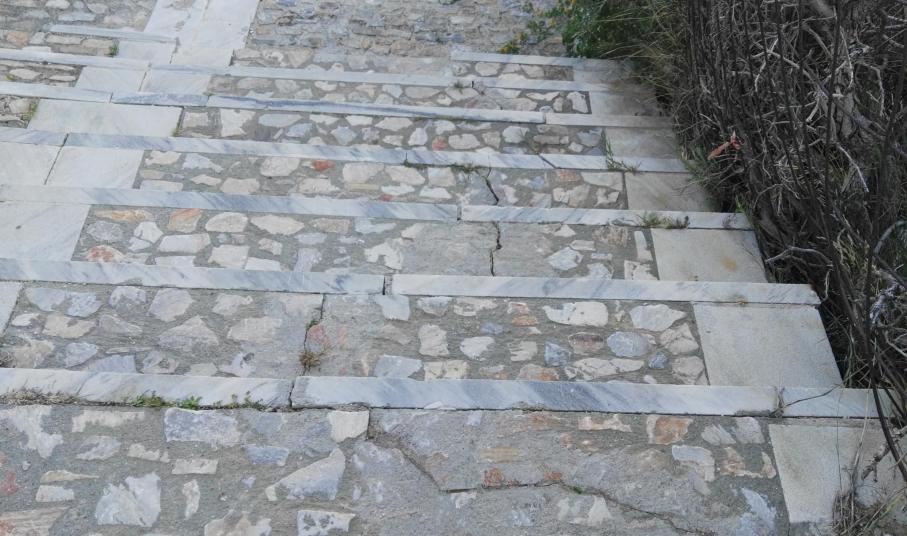 Πρόκειται για την κάθετη οδό προς το δρόμο, στο ύψος της στροφής του πολυσυζητημένου σημείου της θέσης “Βούρλη”, στην οποία διαπιστώνονται σοβαρά θέματα. Εκτός από την αποκόλληση των κάθετων μαρμάρων που “συγκρατούν” τα σκαλοπάτια, έχουν διαπιστωθεί και σημαντικές ρωγμές στις επιφάνειές τους, οι οποίες σχετίζονται με τα ζητήματα των κατολισθητικών φαινομένων της περιοχής, τα οποία και θα αντιμετωπισθούν βάσει της μελέτης που αναμένει ο Δήμος Σύρου – Ερμούπολης.