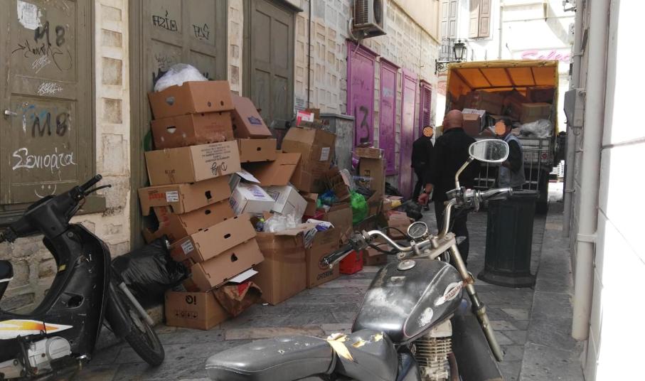 Κάκιστη η εικόνα της κάθετης - προς τον πεζόδρομο της Πρωτοπαπαδάκη – οδού, εξαιτίας του όγκου των άδειων “κιβωτίων” που άφησαν επιχειρηματίες το πρωί του Μ. Σαββάτου