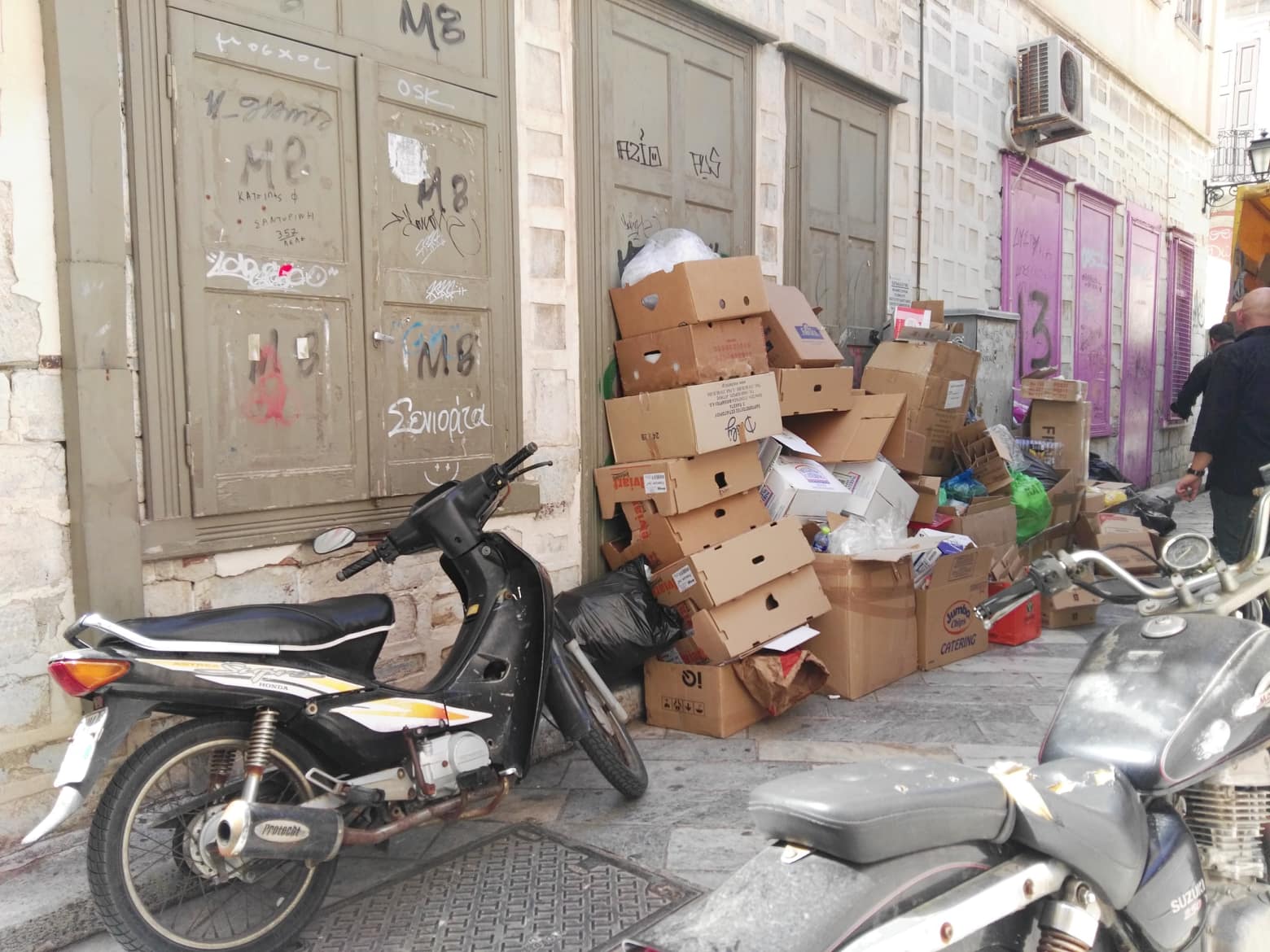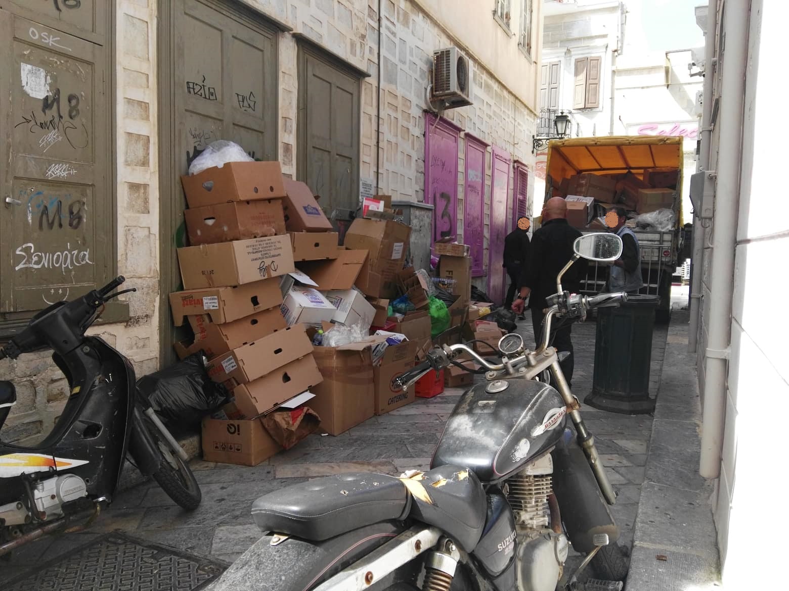 Σε οδό απροσπέλαστη εξαιτίας του όγκου των απορριμμάτων και των άδειων κιβωτίων που είχαν αφεθεί από επιχειρηματίες της περιοχής, μετατράπηκε ο μικρός πεζόδρομος της “Ανάφης” το πρωί του Μ. Σαββάτου, με αποτέλεσμα στην “καρδιά” της πόλης που υποδέχθηκε μεγάλο αριθμό επισκεπτών την Πασχαλινή περίοδο, να έχει διαμορφωθεί ένας μικρός σκουπιδότοπος.