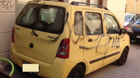 Συγκεκριμένα, όπισθεν του 4ου Δημοτικού Σχολείου Σύρου όχημα καταστράφηκε σχεδόν “ολοκληρωτικά”, αφού οι επιφάνειές του αποτέλεσαν δυστυχώς των “καμβά” αγνώστων προκειμένου να γράψουν συνθήματα και τα αρχικά κομματικού συνδυασμού.