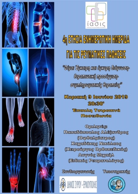 Ο σύλλογος ρευματοπαθών και φίλων Κυκλάδων Ίασις διοργανώνει την 4η ετήσια ενημερωτική ημερίδα για τα ρευματικά νοσήματα . Η εκδήλωση θα πραγματοποιηθεί την Κυριακή 9 Ιουνίου ώρα 20.30 στην έπαυλη Τσιροπινά στην Ποσειδωνία.