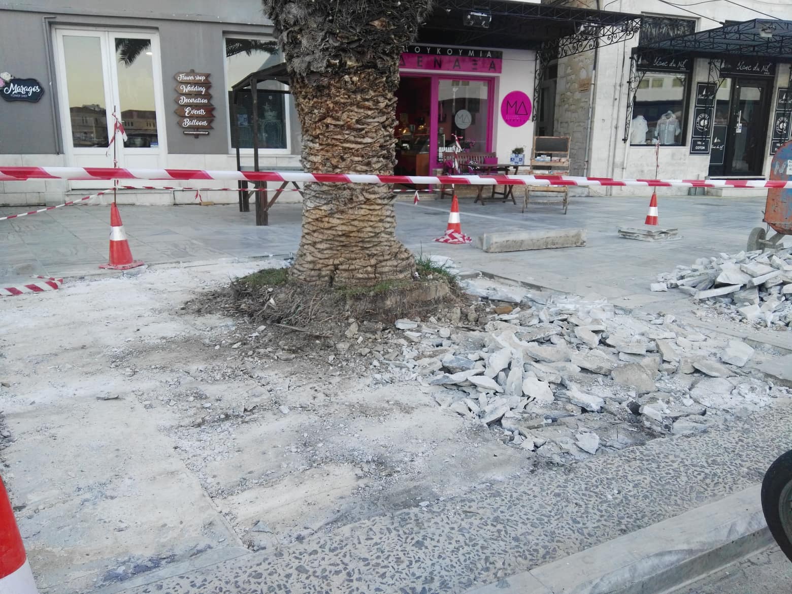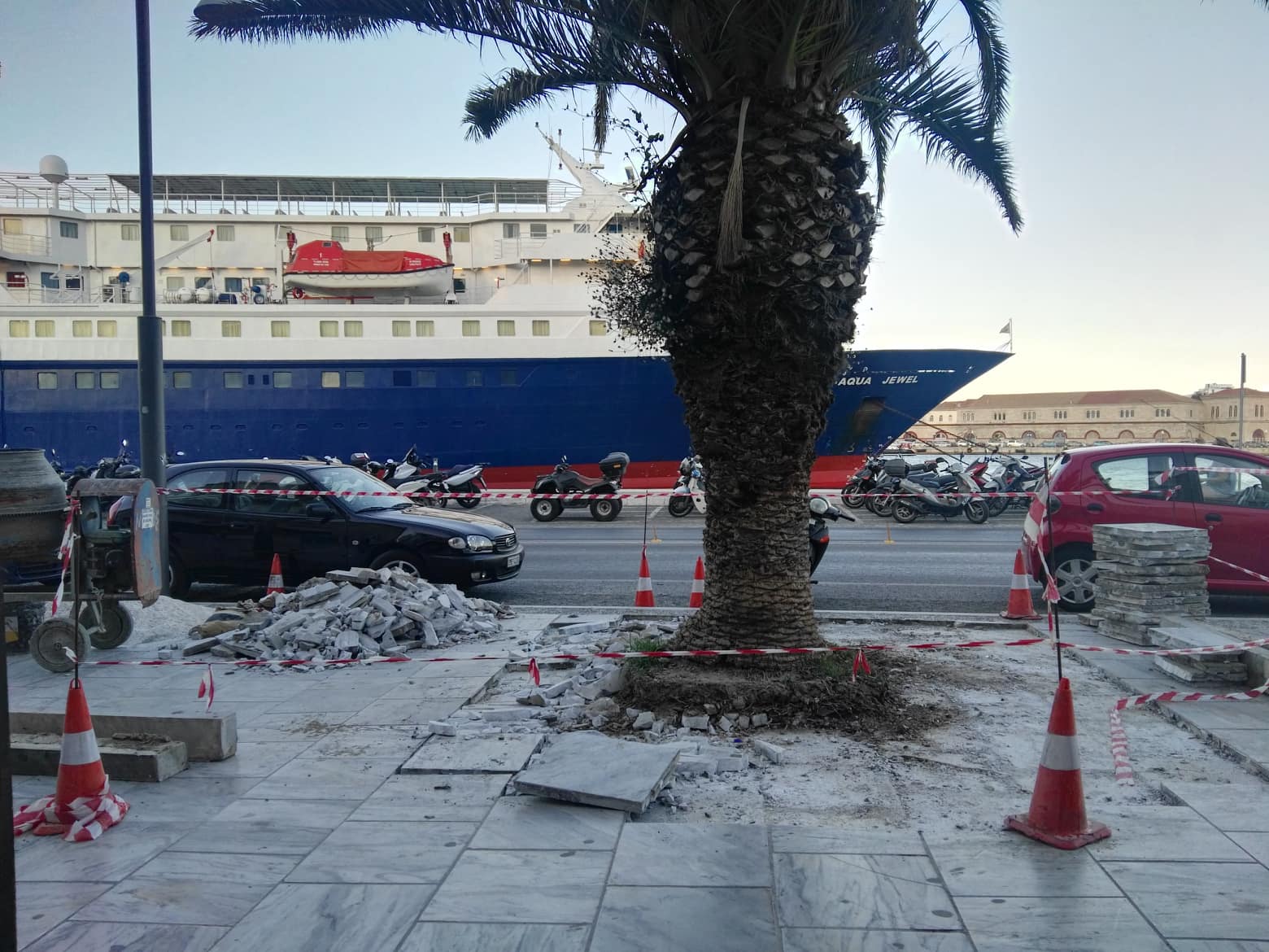 Αναλυτικότερα, τα τελευταία 24ωρα οι παρεμβάσεις υλοποιούνται περιμετρικά των βάσεων που έχουν τοποθετηθεί τα φοινικοειδή και ειδικότερα, στο ύψος περίπου του κτιρίου της Αποκεντρωμένης Διοίκησης Αιγαίου.
