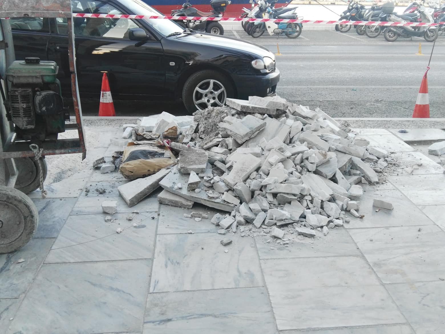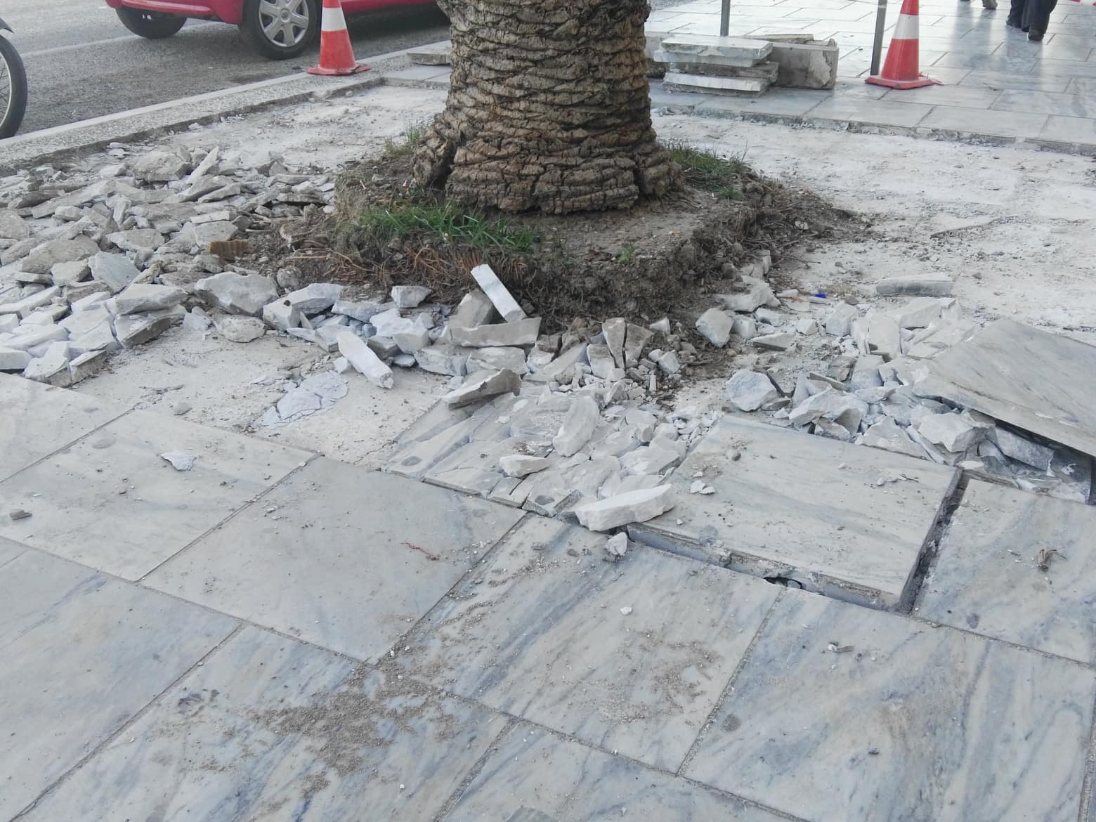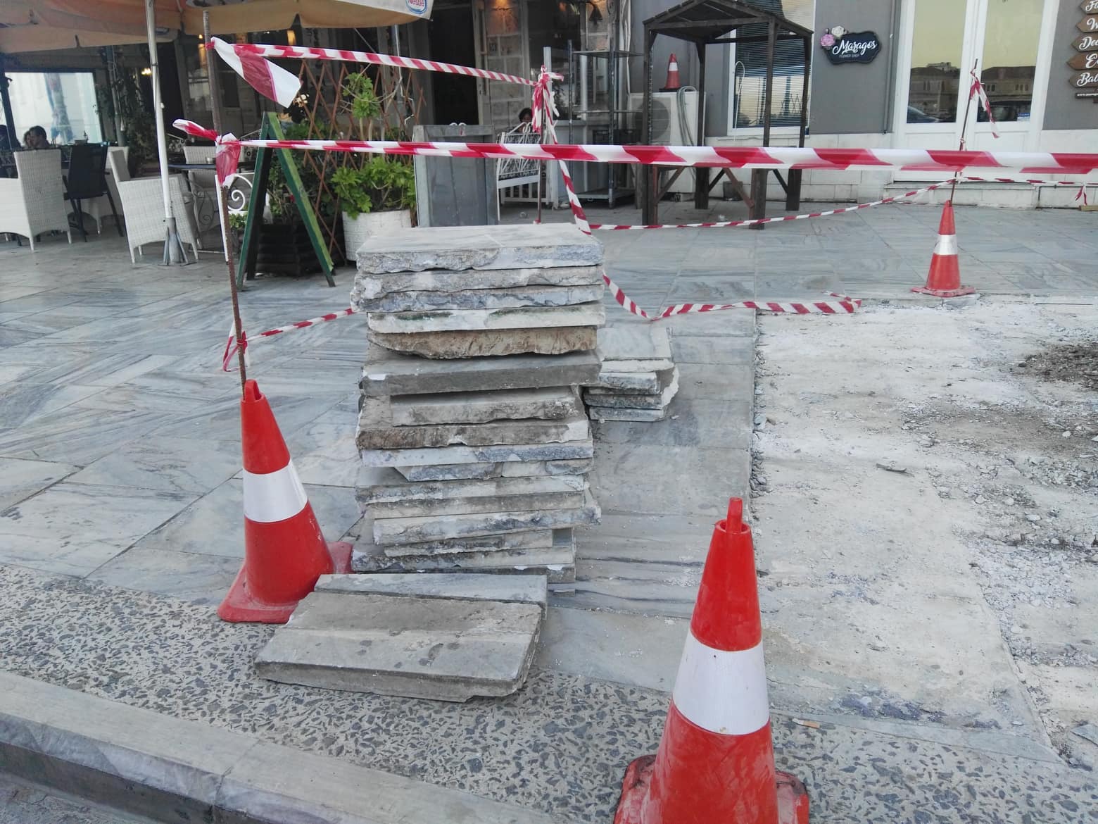 Στα συγκεκριμένα σημεία είχε “σπάσει” η μαρμάρινη πλακόστρωση, ενώ είχαν προκληθεί και ανομοιομορφίες, με αποτέλεσμα να είναι ορατός ο κίνδυνος περαιτέρω καταστροφής τους. Οι εργάτες αρχικά απομάκρυναν τις παλαιές πλάκες και αφού προχώρησαν στις κατάλληλες παρεμβάσεις, θα προβούν στην επανατοποθέτησή τους ή στην αντικατάστασή τους με νέες, ώστε η επιφάνεια που περπατούν οι πεζοί να ομαλοποιηθεί.