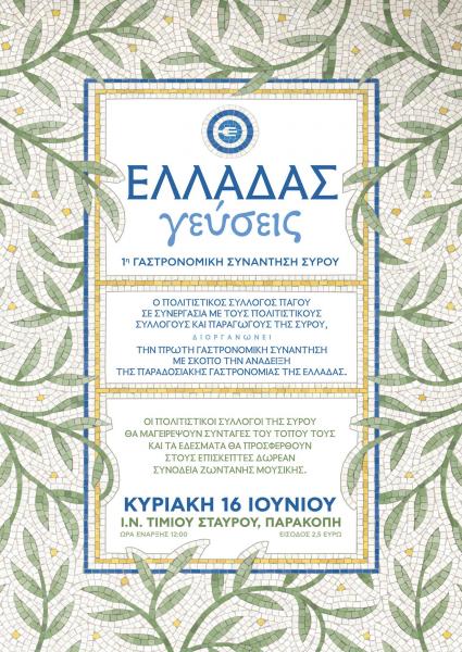 Στον φιλόξενo προαύλιο χώρο της εκκλησίας του Σταυρού στην Παρακοπή, την 16η Ιούνη, ημέρα Κυριακή και ώρα 12 το μεσημέρι, ο Πολιτιστικός Σύλλογος Πάγου, σε συνεργασία με τους πολιτιστικούς συλλόγους και παραγωγούς της Σύρου, διοργανώνει την πρώτη Πανσυριανή γαστρονομική συνάντηση, με σκοπό την ανάδειξη των ιδιαίτερων τοπικών χαρακτηριστικών της παραδοσιακής γαστρονομίας της Ελλάδας. Στην συνάντηση αυτή, θα συμμετέχουν Σύλλογοι της Σύρου και μεμονωμένα πρόσωπα, παρουσιάζοντας συνταγές του τόπου τους καθώς και Παραγωγοί συριανών προϊόντων. Μέσα από αυτήν την πρώτη μας δράση γίνεται μια προσπάθεια γνωριμίας αλλά και ανάδειξης των ποιοτικών προϊόντων του πλούσιου πρωτογενή μας τομέα. Τα εδέσματα θα προσφερθούν στους επισκέπτες δωρεάν, συνοδεία ζωντανής μουσικής. Σας προσκαλούμε να συμμετέχετε ενεργά σε αυτήν την πρώτη γαστρονομική συνάντηση. Είσοδος 2,50 €/άτομο. Πληροφορίες στα τηλέφωνα 6947727278 και 6973327121.