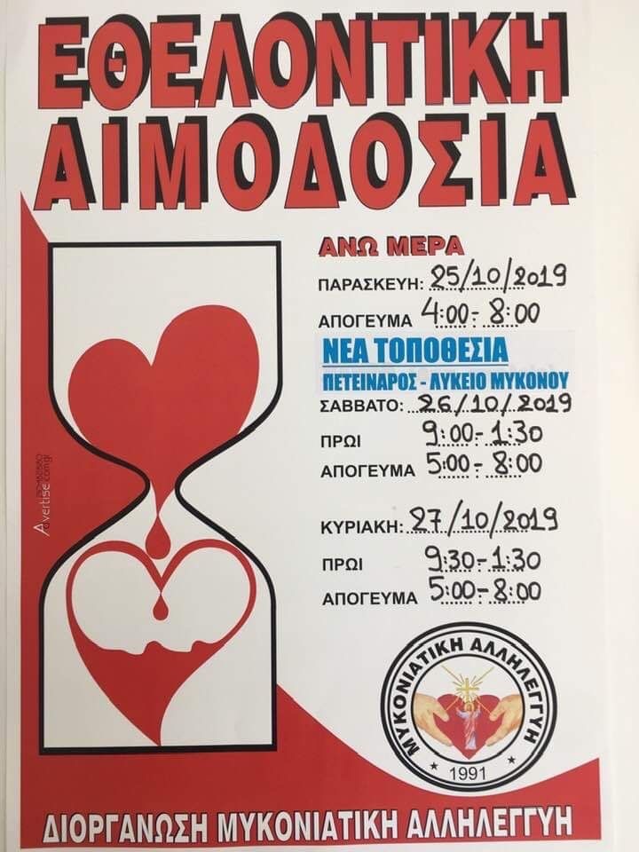 Ο Δήμαρχος Μυκόνου ενημερώνει τους κατοίκους του νησιού πως η Μυκονιάτικη Αλληλεγγύη, όπως κάθε χρόνο έτσι και φέτος, θα πραγματοποιήσει προγραμματισμένη αιμοδοσία στις 25, 26 και 27 Οκτωβρίου 2019 και καλεί όλους του Μυκονιάτες, καθώς και τους επισκέπτες του νησιού να στηρίξουν αυτή την σημαντική προσπάθεια.