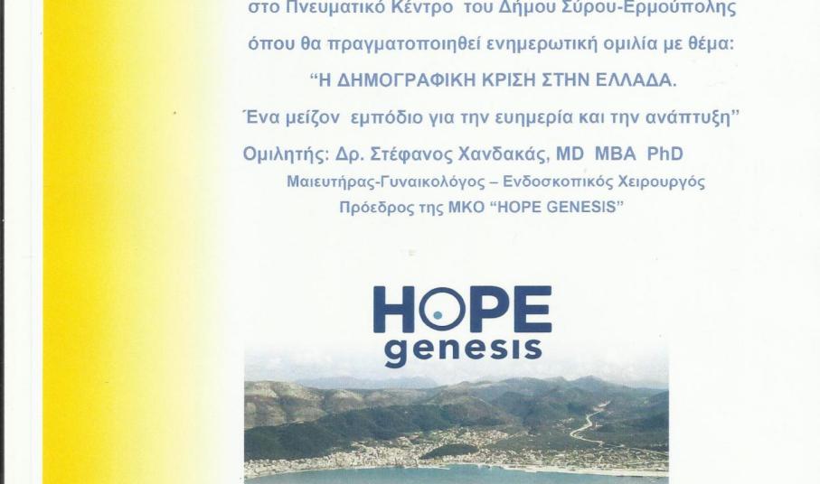 Ομιλητής ο Δρ. Στέφανος Χανδακάς MD, MBA, PhD Μαιευτήρας – Γυναικολόγος – Ενδοσκοπικός Χειρουργός, Πρόεδρος της ΜΚΟ “HOPE GENESIS”.