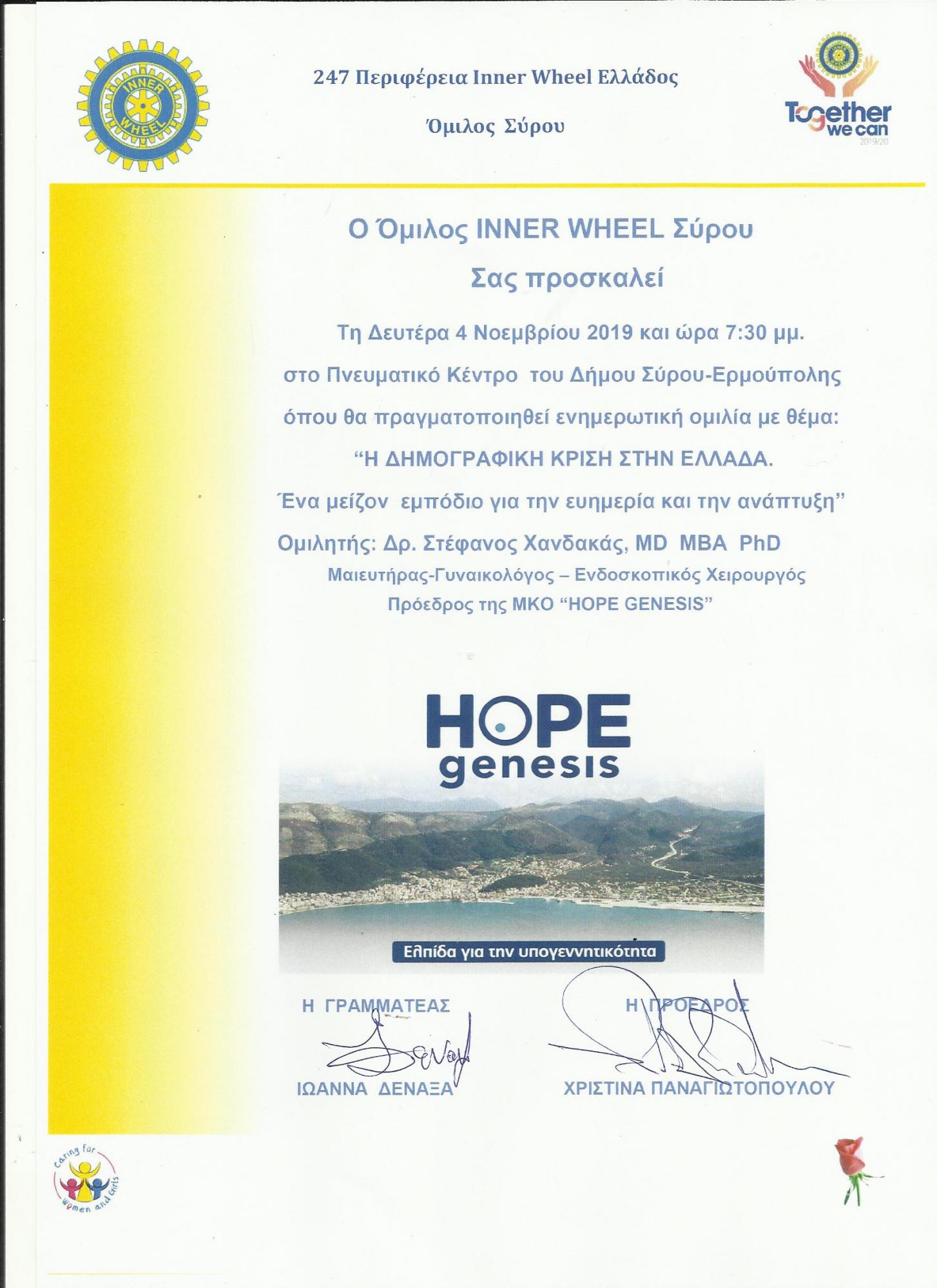 Ο Όμιλος Inner Wheel Σύρου διοργανώνει τη Δευτέρα 4 Νοεμβρίου 2019 και ώρα 07:30μ.μ. στο Πνευματικό Κέντρο του Δήμου Σύρου-Ερμούπολης (αίθουσα Ρίτσου) ενημερωτική ομιλία με θέμα: « Η ΔΗΜΟΓΡΑΦΙΚΗ ΚΡΙΣΗ ΣΤΗΝ ΕΛΛΑΔΑ. Ένα μείζον εμπόδιο για την ευημερία και την ανάπτυξη»