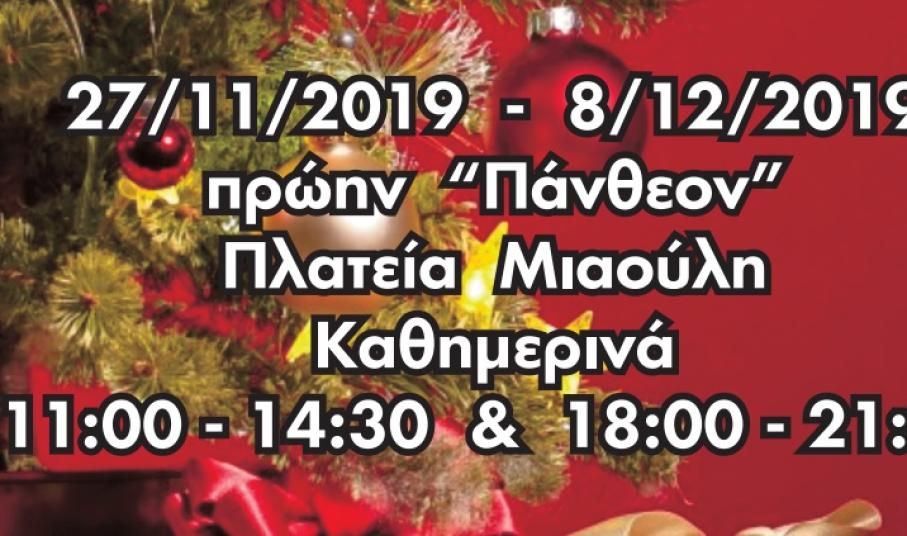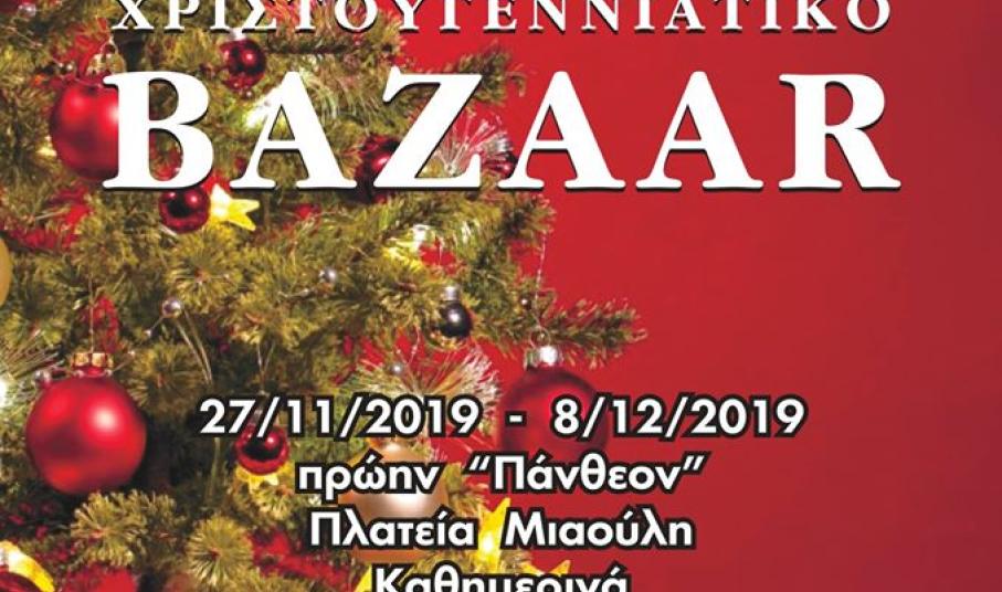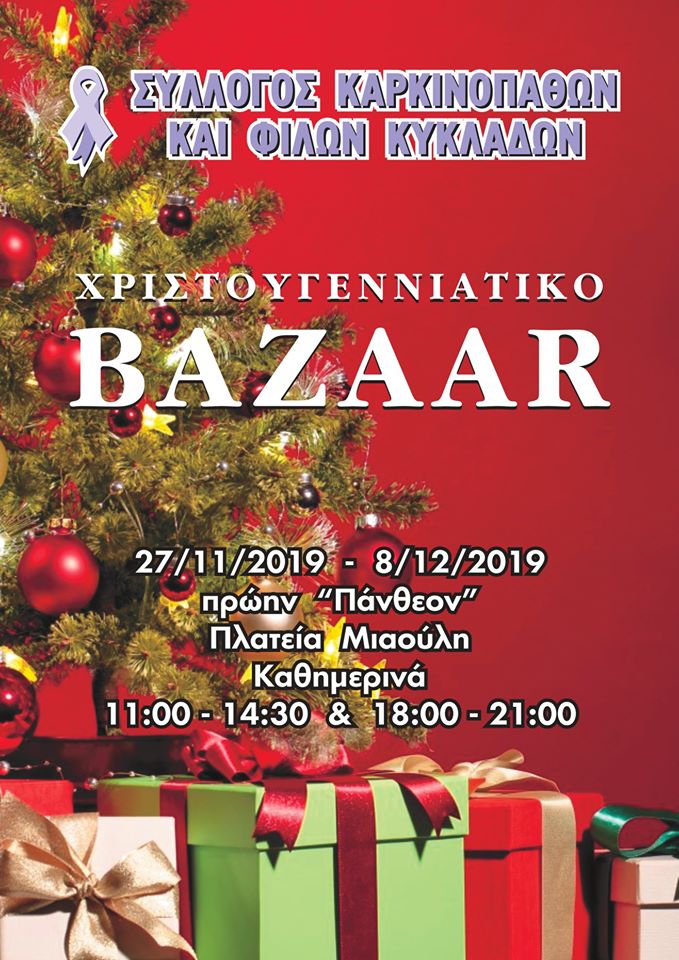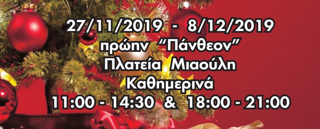 Σας περιμένουμε στο Χριστουγεννιάτικο Bazaar του Συλλόγου μας, καθημερινά, από την Τετάρτη 27 Νοεμβρίου έως και την Κυριακή 8 Δεκεμβρίου και ώρες 11:00 με 2:30 το μεσημέρι & 6:00 με 9:00 το βράδυ, στο πρώην Πάνθεον, στην Πλατεία Μιαούλη.