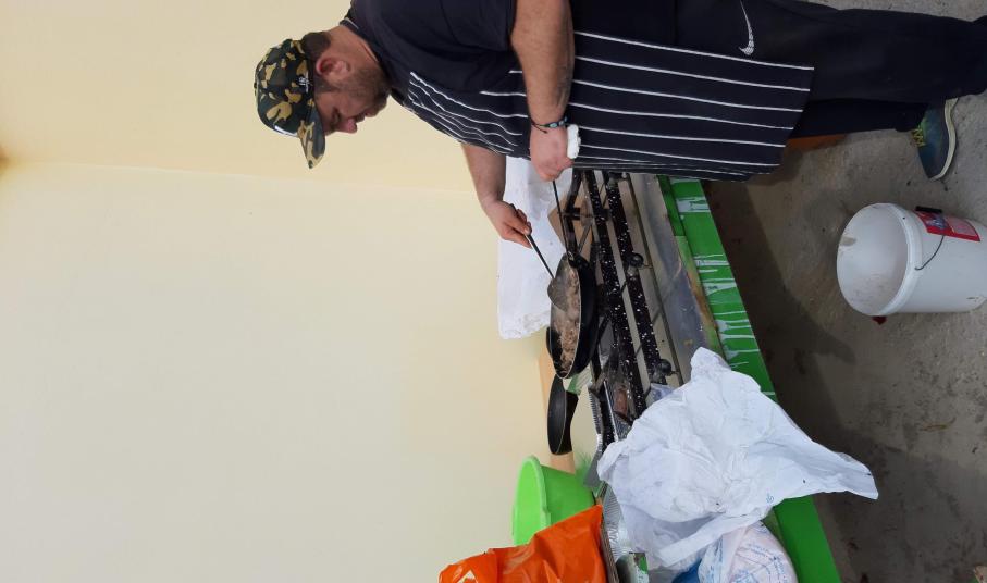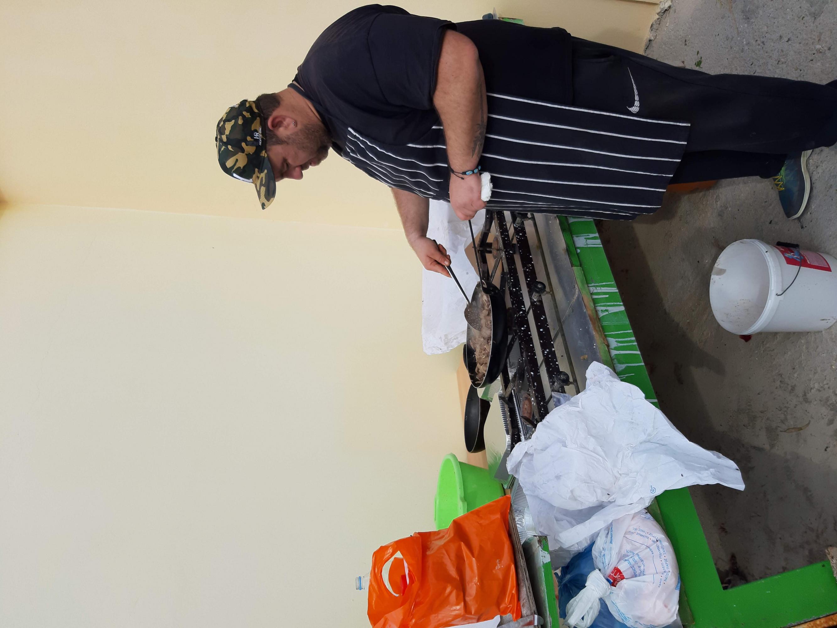 Εκεί ολοκληρώθηκε η προετοιμασία των υπόλοιπων προϊόντων του ζώου: λουκάνικα, τηγανιά, μπιφτέκια και γουρουνόσουπα σερβιρίστηκαν στα τραπέζια και συμπληρώθηκαν από φαγητά και γλυκά που είχαν παρασκευάσει οι γυναίκες του Ομίλου. Λόγω και του μεγάλου μεγέθους του ζώου, ο Όμιλος πρόσφερε μεγάλη ποσότητα σούπας σε δύο γηροκομεία της Ερμούπολης.