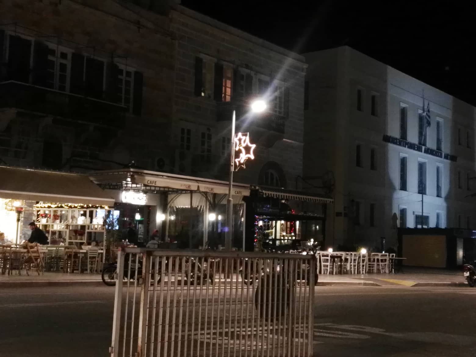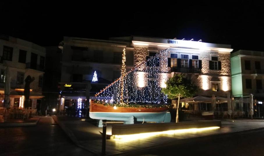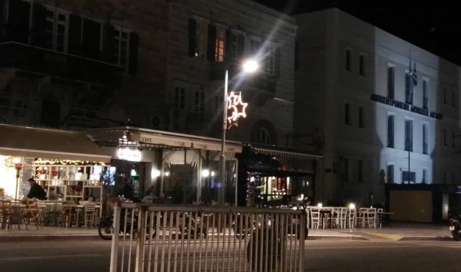 Σε ρυθμούς Χριστουγέννων “χορεύει” πλέον η Ερμούπολη, αφού ολοκληρώθηκε ο στολισμός της και στο παραλιακό μέτωπό της, στους χώρους κατά μήκος των επιχειρήσεων εστίασης και των πεζοδρομίων.