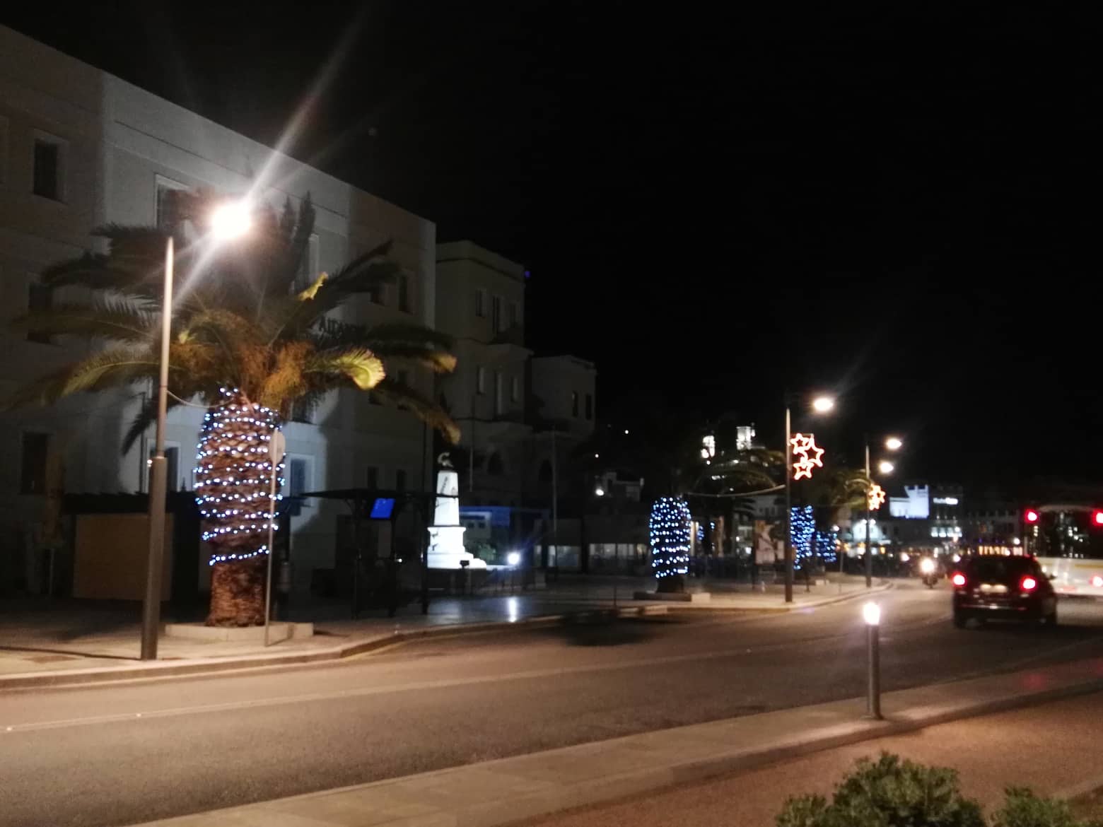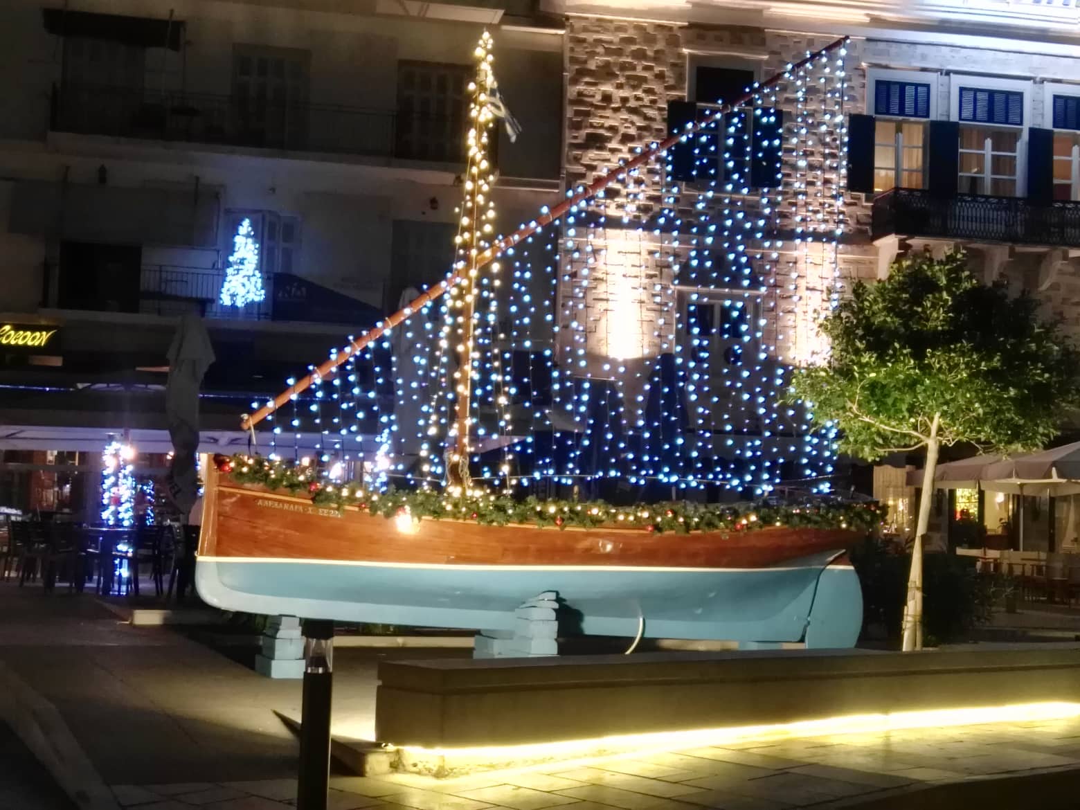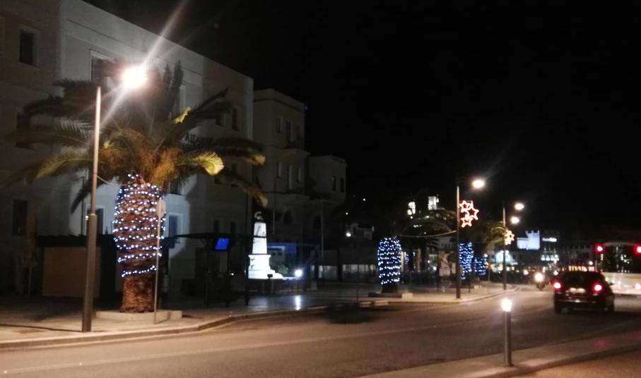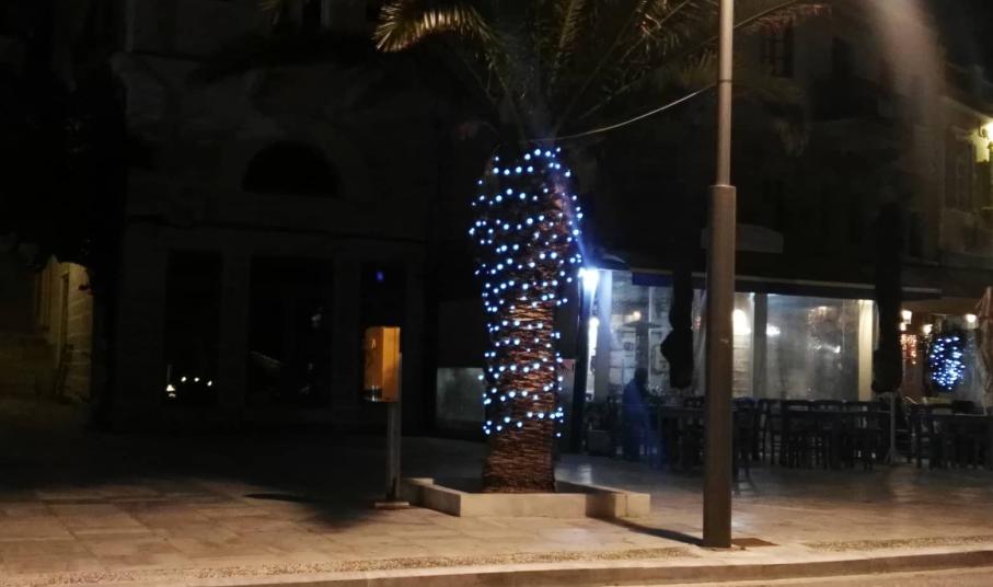 Το Χριστουγεννιάτικο σκηνικό στην πόλη συμπληρώθηκε από τον στολισμό των φοινικοειδών που υπάρχουν στο παραλιακό μέτωπο με μπλε μικρά φώτα που “αγκαλιάζουν” τη βάση τους, ενώ οι πολίτες του νησιού μπορούν να απολαύσουν για μία ακόμη χρονιά το πανέμορφο ξύλινο σκαρί που έχει τοποθετηθεί σε κενό χώρο πεζοδρομίου.