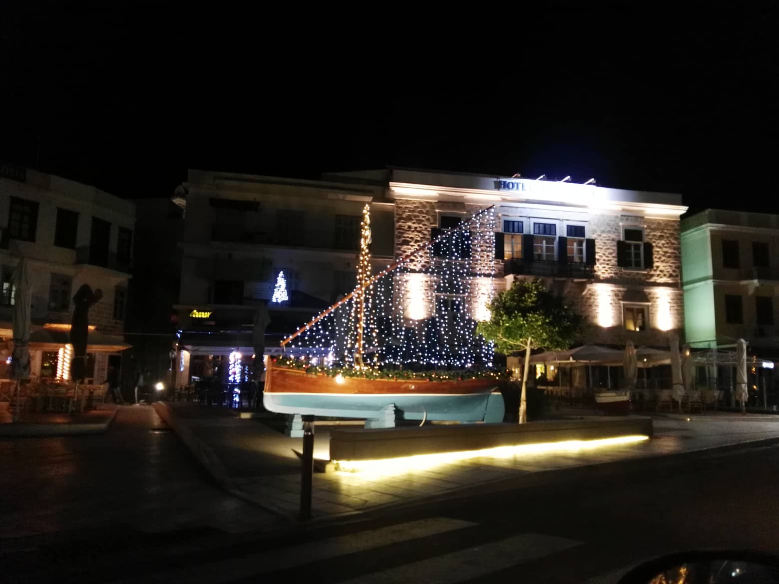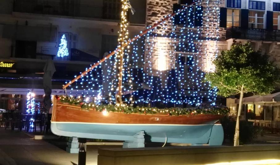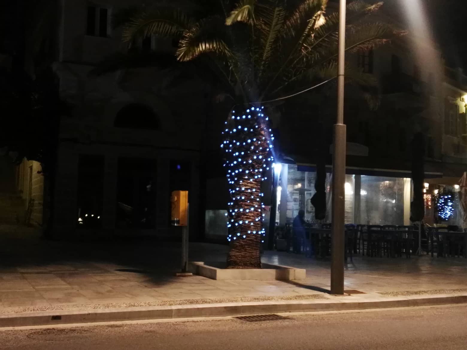 Το Χριστουγεννιάτικο σκηνικό στην πόλη συμπληρώθηκε από τον στολισμό των φοινικοειδών που υπάρχουν στο παραλιακό μέτωπο με μπλε μικρά φώτα που “αγκαλιάζουν” τη βάση τους, ενώ οι πολίτες του νησιού μπορούν να απολαύσουν για μία ακόμη χρονιά το πανέμορφο ξύλινο σκαρί που έχει τοποθετηθεί σε κενό χώρο πεζοδρομίου.