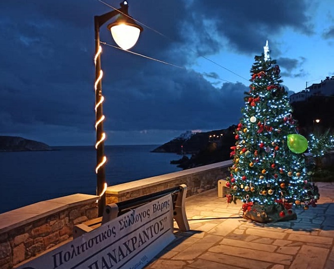 Με ξεχωριστή διάθεση, ιδιαίτερο κέφι και μεγάλα χαμόγελα οι δημότες του χωριού έβαλαν τα στολίδια τους επάνω στο χριστουγεννιάτικο δέντρο, το οποίο τοποθετήθηκε επί του πεζοδρομίου πλησίον του κεντρικού δρόμου της περιοχής και πάνω από τον όρμο της Βάρης, προκειμένου να διακρίνεται από κάθε πολίτη που μετακινείται από και προς το σημείο, αλλά και να κοσμεί μία κεντρική θέση του χωριού.