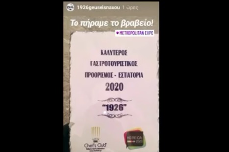 Μάλιστα, πρέπει να αναφερθεί, ότι το «1926» απέσπασε το βραβείο έχοντας συγκεντρώσει την καλύτερη βαθμολογία με βάση πάρα πολύ σημαντικά κριτήρια γαστροτουρισμού, όπως η σωστή χρήση τοπικών πρώτων υλών, η προβολή τοπικών συνταγών, η προβολή σε έντυπα, η βαθμολογία σε ταξιδιωτικές πλατφόρμες και άλλα πολλά, με τη βράβευση να αποτελεί, επί της ουσίας, μία... επι-βράβευση της δουλειάς του εστιατορίου πάνω στην ανάδειξη και αξιοποίηση των τοπικών προϊόντων της Νάξου!