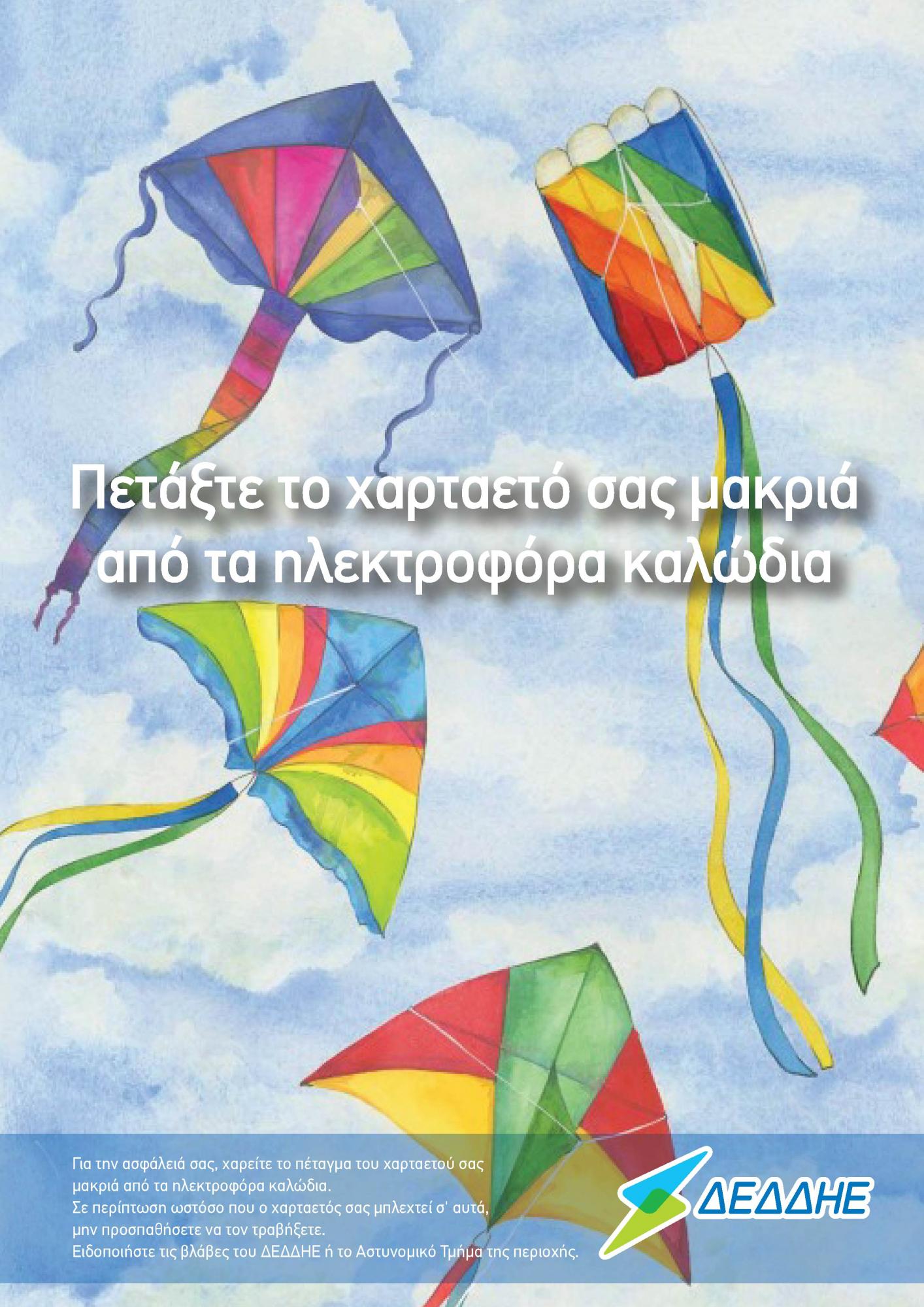 Ο Διαχειριστής Ελληνικού Δικτύου Διανομής Ηλεκτρικής Ενέργειας (ΔΕΔΔΗΕ) σας συμβουλεύει να μην πετάτε το χαρταετό σας κοντά σε ηλεκτροφόρα καλώδια, καθώς υπάρχει σοβαρός κίνδυνος ηλεκτροπληξίας για εσάς και διακοπής της παροχής ρεύματος στη γύρω περιοχή.