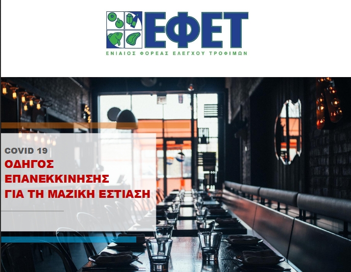 Ο Ενιαίος Φορέας Ελέγχου Τροφίμων (Ε.Φ.Ε.Τ.) σε συνεργασία με το Σύνδεσμο Ελληνικών Βιομηχανιών Τροφίμων (Σ.Ε.Β.Τ.) και την Ελληνική Ένωση Επιχειρήσεων Οργανωμένης Εστίασης (ΕΠ.Ο.ΕΣ), ενόψει της επαναλειτουργίας των επιχειρήσεων Μαζικής Εστίασης από τις 25 Μαΐου 2020, εκδίδει τον «Οδηγό Επανεκκίνησης για τη Μαζική Εστίαση» με σκοπό την παροχή απλών και πρακτικών οδηγιών προσαρμογής στο πλαίσιο της νέας πραγματικότητας που έχει δημιουργηθεί από τη νόσο COVID-19. Οι οδηγίες βασίζονται στην ανάλυση του προφίλ επικινδυνότητας του ιού για τους χώρους εστίασης και στις βέλτιστες πρακτικές όπως αυτές αποτυπώνονται σε διεθνείς και εθνικές συστάσεις.