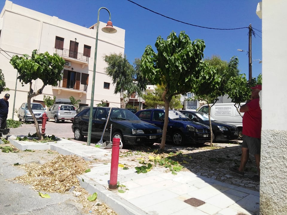 Αμέσως μετά από τις εργασίες κλαδέματος, τα κλαδιά που αφαιρέθηκαν, φορτώθηκαν σε μικρό δημοτικό όχημα, προκειμένου να απομακρυνθούν από την πλατεία.