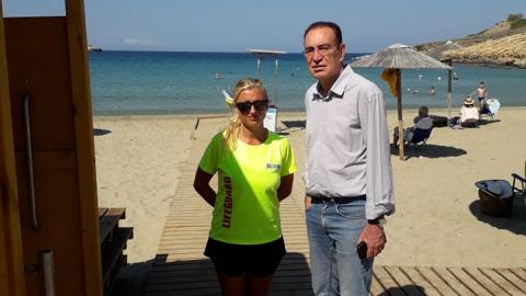 Στο πλαίσιο του προσβάσιμου τουρισμού και του γενικότερου σχεδιασμού της Δημοτικής Αρχής για την άρση του κοινωνικού αποκλεισμού και την κοινωνική ένταξη ευπαθών ομάδων πληθυσμού, πραγματοποιήθηκε αυτοψία από τον Δήμαρχο Σύρου – Ερμούπολης κ. Νικόλαο Λειβαδάρα, παρουσία του Αντιδημάρχου Τεχνικών Υπηρεσιών κ. Μηνά Αληφραγκή, του Αντιδημάρχου Τουρισμού κ. Παναγιώτη Κουταβά, της Εντεταλμένης Δημοτικής Συμβούλου κας Αγγελική Πρίντεζη και της Προέδρου της Τοπικής Κοινότητας Ποσειδωνίας κας Τέτας Πρίντεζη, στις παραλίες του Γαλησσά και των Αγκαθωπών, όπου τοποθετήθηκαν και εγκαταστάθηκαν συστήματα αυτόνομης πρόσβασης στη θάλασσα, διάδρομοι πρόσβασης από τους χώρους στάθμευσης, ξύλινο αποδυτήριο και ομπρέλες για χρήση από Α.μ.Ε.Α..