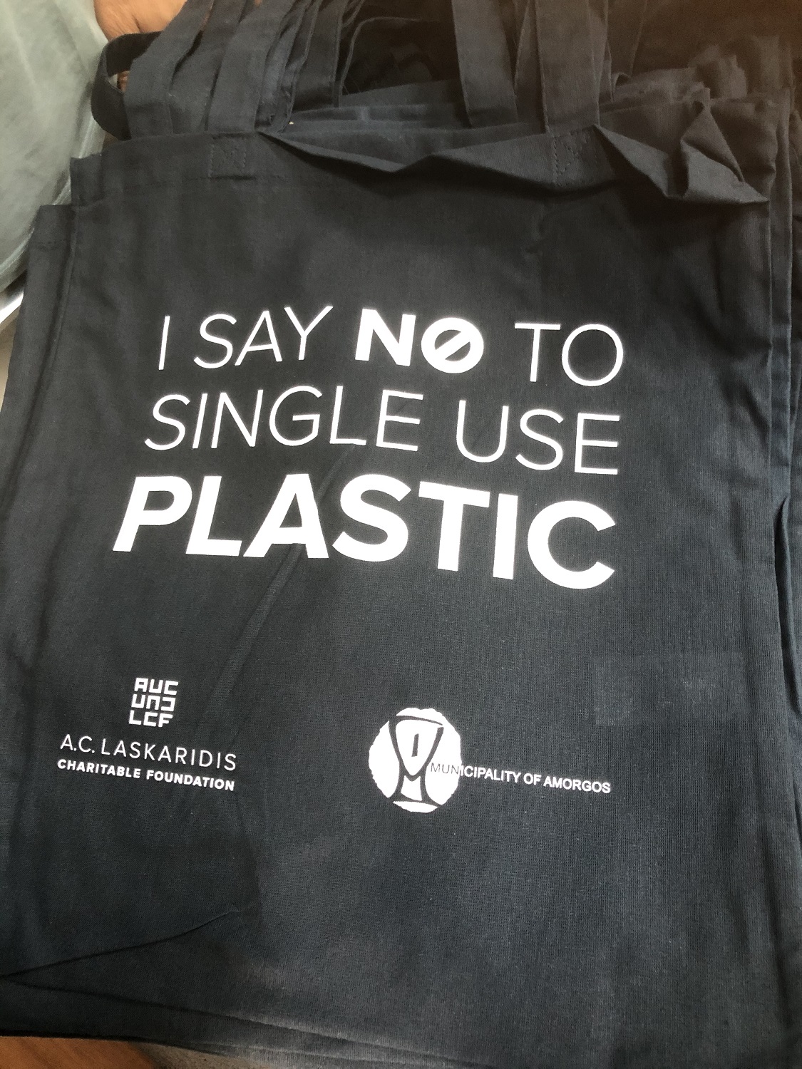 Η δράση «Share the Bag Amorgos» δίνει τη δυνατότητα στους καταναλωτές να περιορίσουν τη χρήση πλαστικής σακούλας από την καθημερινότητά τους και να χρησιμοποιούν τις οικολογικές πάνινες τσάντες. Ο Δήμος Αμοργού ξεκίνησε τη διανομή 800 τεμαχίων στους ιδιοκτήτες των σούπερ μάρκετ. Τις τσάντες τύπωσε με έξοδά του το Ίδρυμα Λασκαρίδη.
