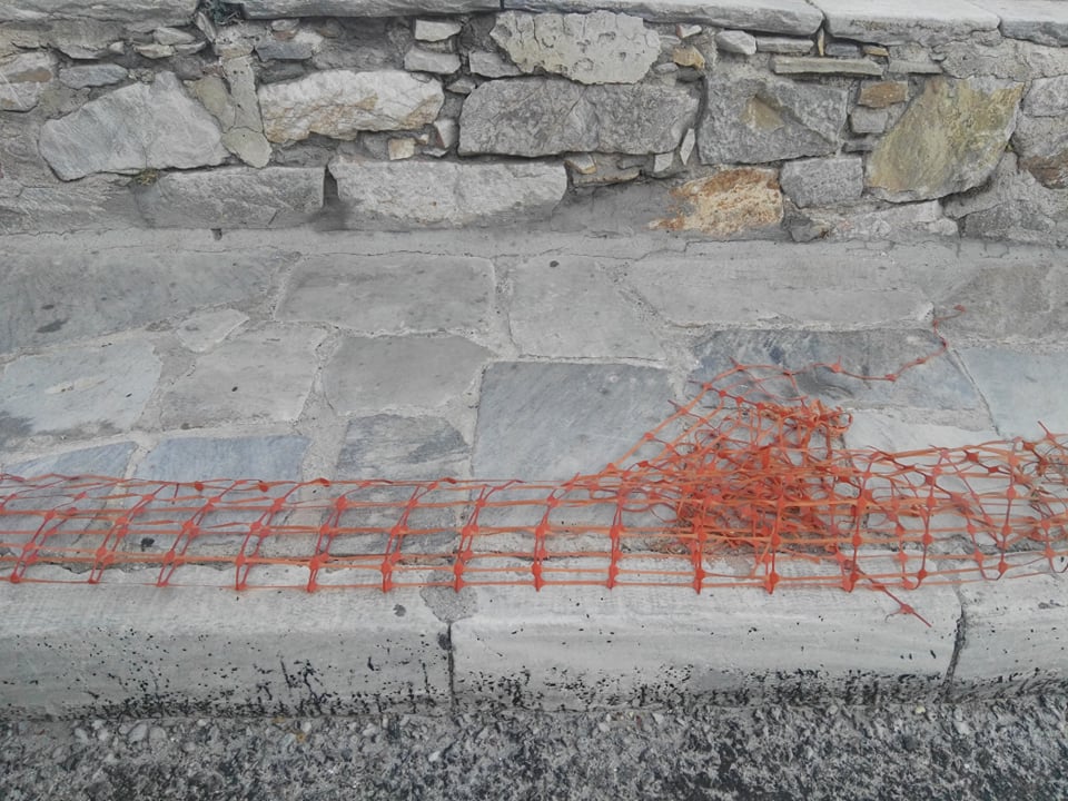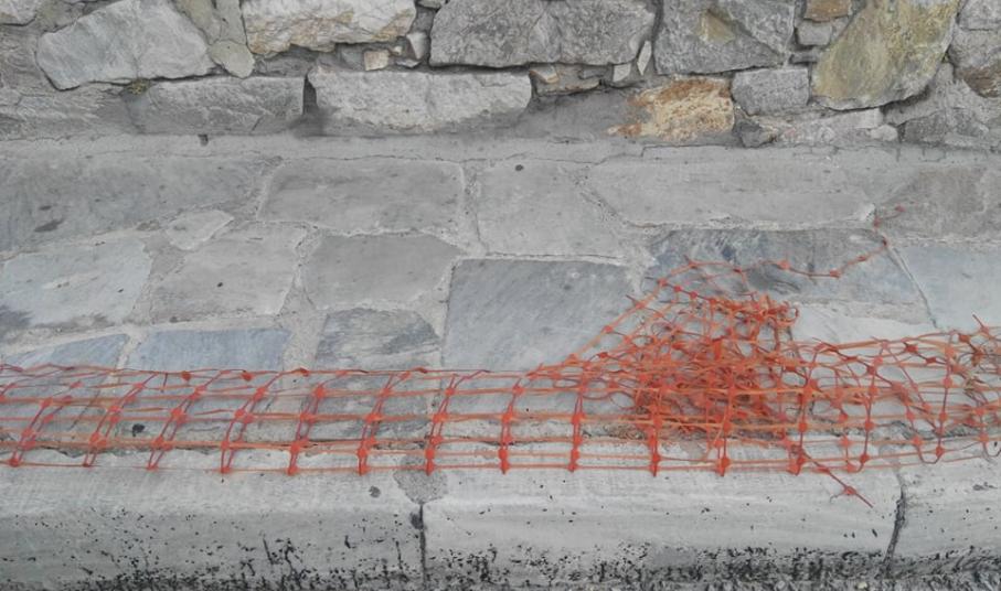 Ειδικότερα, το πορτοκαλί πλέγμα έχει μετατοπιστεί από την αρχική θέση του, ενώ οι ιδιαιτέρως επικίνδυνες μπετόβεργες επί των οποίων στηριζόταν, έχουν αποκτήσει απότομη κλίση προς τον δρόμο.