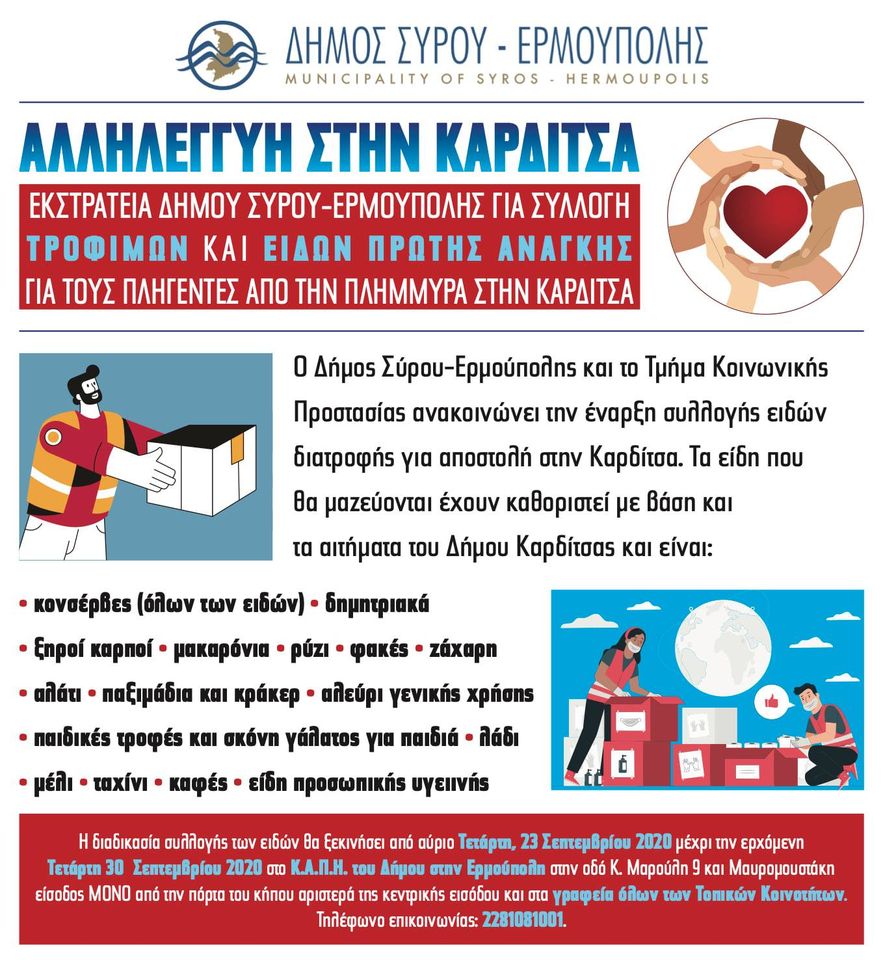 Eθελοντική δράση της Κοινωνικής Υπηρεσίας του Δήμου Σύρου - Ερμούπολης για τους πληγέντες της Καρδίτσας. Δείτε αναλυτικά την αφίσα του Δήμου.