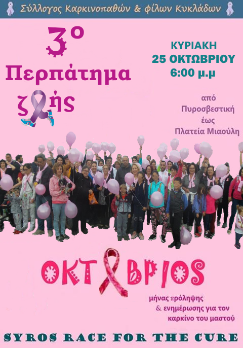 Ο Σύλλογος Καρκινοπαθών και Φίλων Κυκλάδων διοργανώνει το 3ο περπάτημα ζωής την Κυριακή 25 Οκτωβρίου στις 6 το απόγευμα, από το ύψος του κτιρίου της Πυροσβεστικής έως και την πλατεία Μιαούλη.