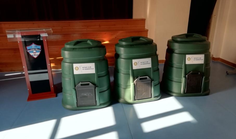 Ο Ροταριανός Όμιλος Ερμούπολης δώρισε τρεις κάδους κομποστοποίησης που θα συμβάλλουν στην αρτιότερη οργάνωση και επιτυχία των στόχων του περιβαλλοντικού προγράμματός , που αποσκοπεί σε ένα σχολείο με μηδενικά απορρίμματα.