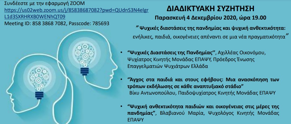 Διαδικτυακή συζήτηση θα πραγματοποιηθεί την Παρασκευή 4/12 στις 19:00 με θέμα: «Ψυχικές διαστάσεις της πανδημίας και ψυχικής ανθεκτικότητα: ενήλικες, παιδιά, οικογένειες απέναντι σε μια νέα πραγματικότητα», στην οποία θα συμμετέχουν θεραπευτές από την Κινητή Μονάδα Ψυχικής Υγείας.